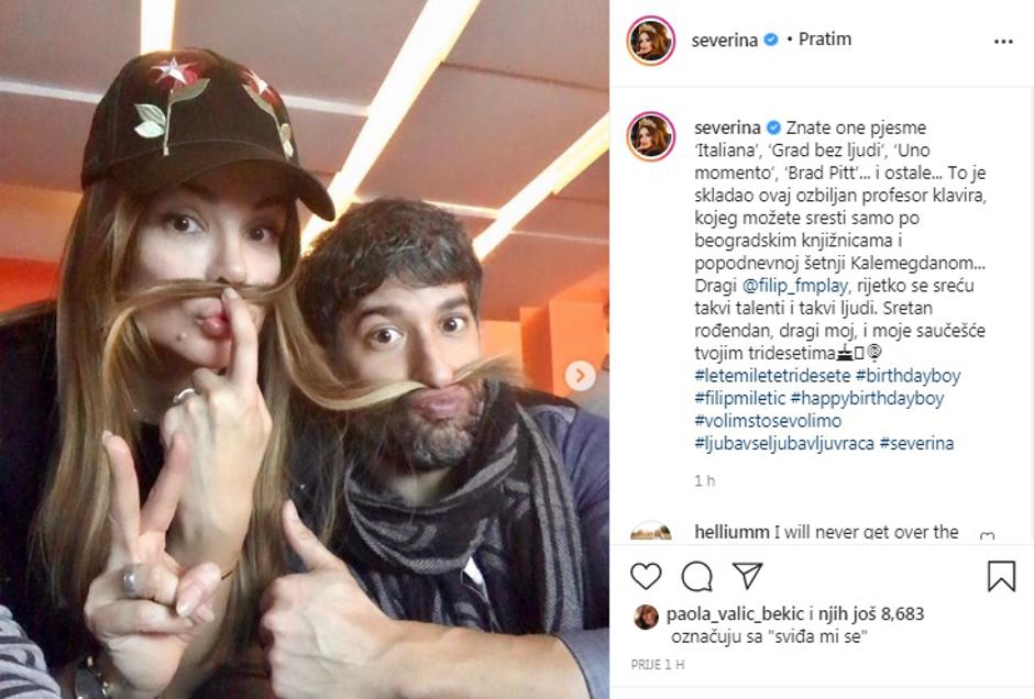 – Znate one pjesme Italiana, Grad bez ljudi, Uno momento, Brad Pitt ... i ostale...To je skladao ovaj ozbiljan profesor klavira, kojeg možete sresti samo po beogradskim knjižnicama i popodnevnoj šetnji Kalemegdanom... Dragi @filip_fmplay, rijetko se sreću takvi talenti i takvi ljudi. Sretan rođendan, dragi moj, i moje saučešće tvojim tridesetima", napisala je pjevačica uz fotografiju na kojoj pozira s Filipom.