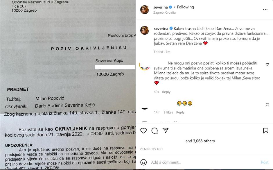 "Kakva krasna čestitka za Dan žena… Zovu me za rođendan, predivno. Rekao bi čovjek da pravna država funkcionira… prezime su pogriješili… Ovakvih imam preko sto. To mora da je ljubav. Sretan vam Dan žena", napisala je Severina i objavila poziv na ročište koji je 21. travnja na njezin rođendan. Poslije ove objave u komentarima su joj se javile brojne obožavateljice i dale podršku.