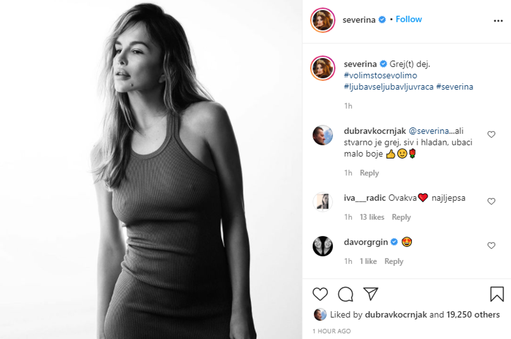 Jednostavno poziranje na crno-bijeloj fotografiji nikada nije bilo izazovnije, barem u slučaju pjevačice Severine Kojić. Na bijeloj pozadini i s minimalnom šminkom pozirala je u haljini ispod koje se jasno oslikavaju bradavice, a komplimenti su se nanizali u rekordnom roku.
