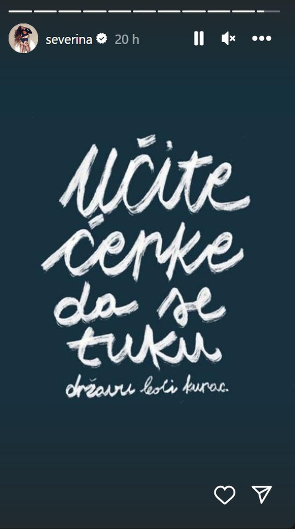 Naime, pjevačica je objavila niz storyja u kojima je podijelila fotografije ljudi s transparentima s prosvjeda za prava žena, ali i naslove novinskih članaka iz Hrvatske i Srbije, a onda je napisala i citat srpske umjetnice Valentine Talijan, koja već nekoliko dana kruži društvenim mrežama: "Učite kćeri da se tuku. Državu boli ku*ac."