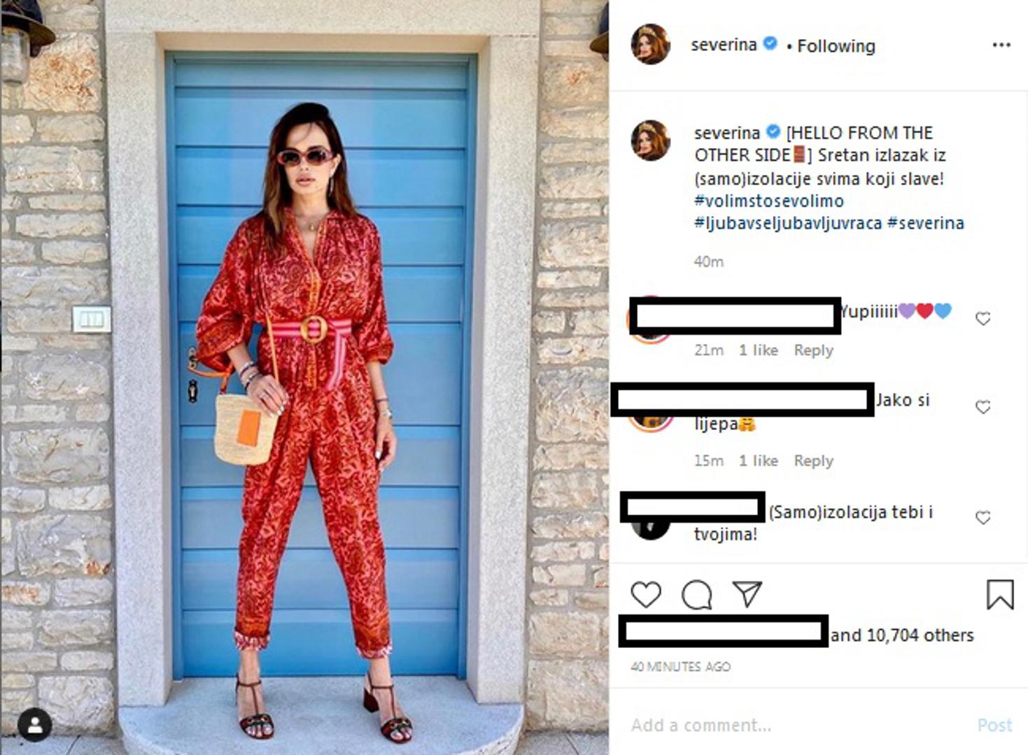 Severina Kojić konačno je izašla iz samoizolacije, a taj trenutak svečano je obilježila i na svom Instagramu. - Pozdrav s druge strane. Sretan izlazak iz (samo)izolacije svima koji slave! - napisala je pjevačica u opisu fotografije kojom je obilježila novo/staro poglavlje svog života. - Živi, pleši, sijaj - poručili su joj pratitelji ispod objave na kojoj pozira dugom crvenom kombinezonu i Gucci sandalama ispred plavih vrata.