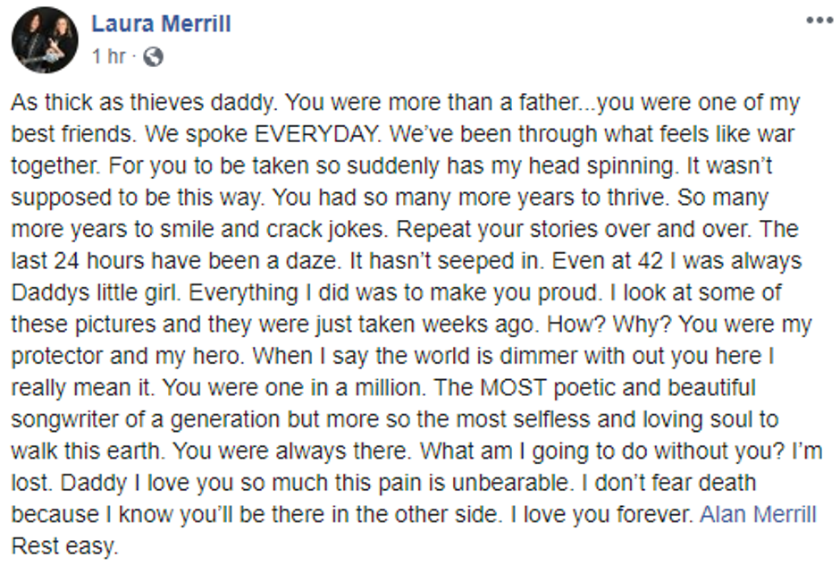 Zauvijek tatice...zauvijek ću te voljeti. Ovo nije stvarno. Nije moguće da sam maloprije bila s tobom i sad te nema. Ne znam kako probaviti ovo. Jednostavno ne znam kako - napisala je potreseno Laura Merrill, kći Alana Merrilla, autora poznatog hita "I love Rock n Roll" i člana benda "The Arrows".