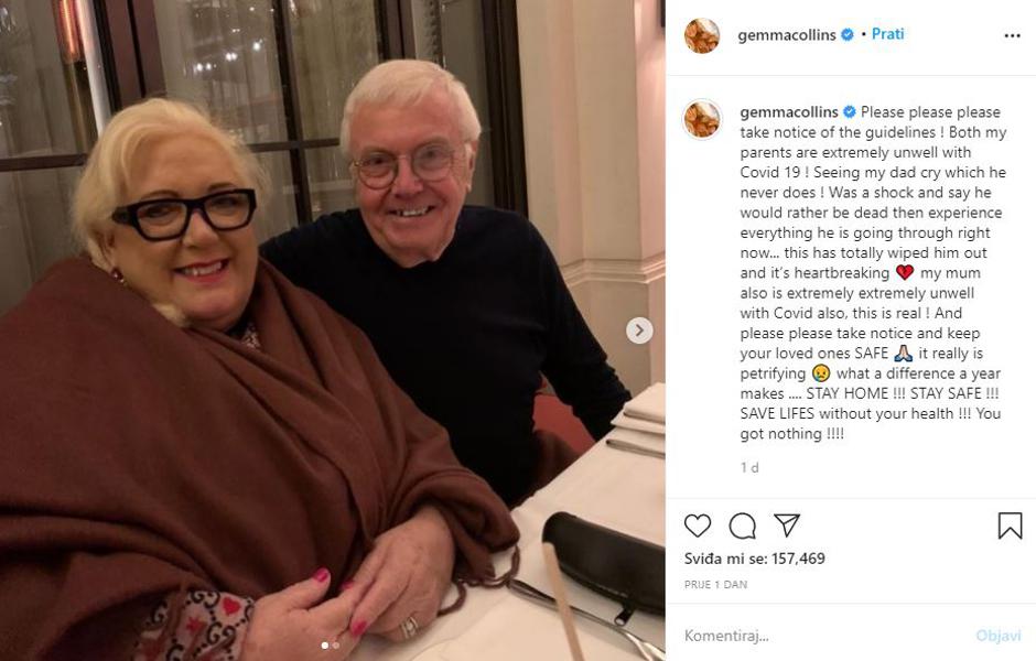 Britanska reality zvijezda Gemma Collins shrvana je zbog bolesti roditelja koji se bore s koronavirusom. Jučer je objavila fotografiju svojih roditelja uz zabrinjavajući opis kojim želi upozoriti sve da se što više paze i poštuju mjere.