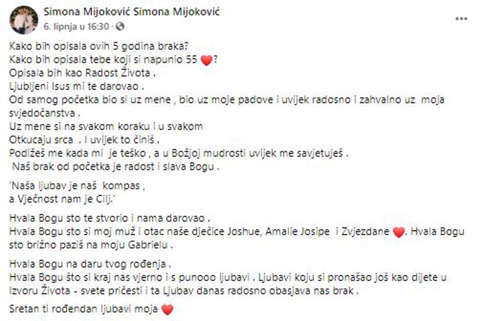 "Kako bih opisala ovih pet godina braka? Kako bih opisala tebe koji si napunio 55 godina? Opisala bih kao radost života. Ljubljeni Isus mi te darovao. Od samog početka bio si uz mene, bio uz moje padove i uvijek radosno i zahvalno uz moja svjedočanstva. Uz mene si na svakom koraku i u svakom otkucaju srca. I uvijek to činiš. Podižeš me kad mi je teško, a u Božjoj mudrosti uvijek me savjetuješ. Naš brak od početka je radost i slava Bogu. Naša ljubav je naš kompas, a Vječnost nam je Cilj. Hvala Bogu što te stvorio i nama darovao. Hvala Bogu sto si moj muž i otac naše dječice Joshue, Amalie Josipe i Zvjezdane. Hvala Bogu što brižno paziš na moju Gabrielu. Hvala Bogu na daru tvog rođenja. Hvala Bogu što si kraj nas vjerno i s puno ljubavi. Ljubavi koju si pronašao još kao dijete u Izvoru Života – svete pričesti i ta Ljubav danas radosno obasjava nas brak. Sretan ti rođendan ljubavi moja", napisala je Simona uz zajedničku fotografiju.
