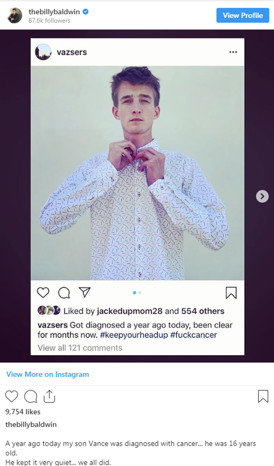 Američki glumac Billy Baldwin, mlađi brat Aleca Baldwina otkrio je da je njegovu sinu Vanceu rak dijagnosticiran prije godinu dana kada je imao samo 16 godina.