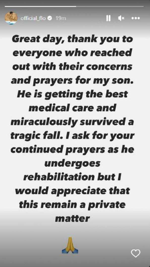 - Divan dan, hvala svima koji su mi se javili i izrazili zabrinutost za mog sina, kao i onima koji su molili za njega. Dobiva najbolju medicinsku skrb i čudom preživljava težak pad. Zamolit ću vas da nastavite s molitvama tijekom njegovog oporavka, ali volio bih da to ostane privatna stvar - napisao je reper uz emotikon ruku sklopljenih u molitvi.