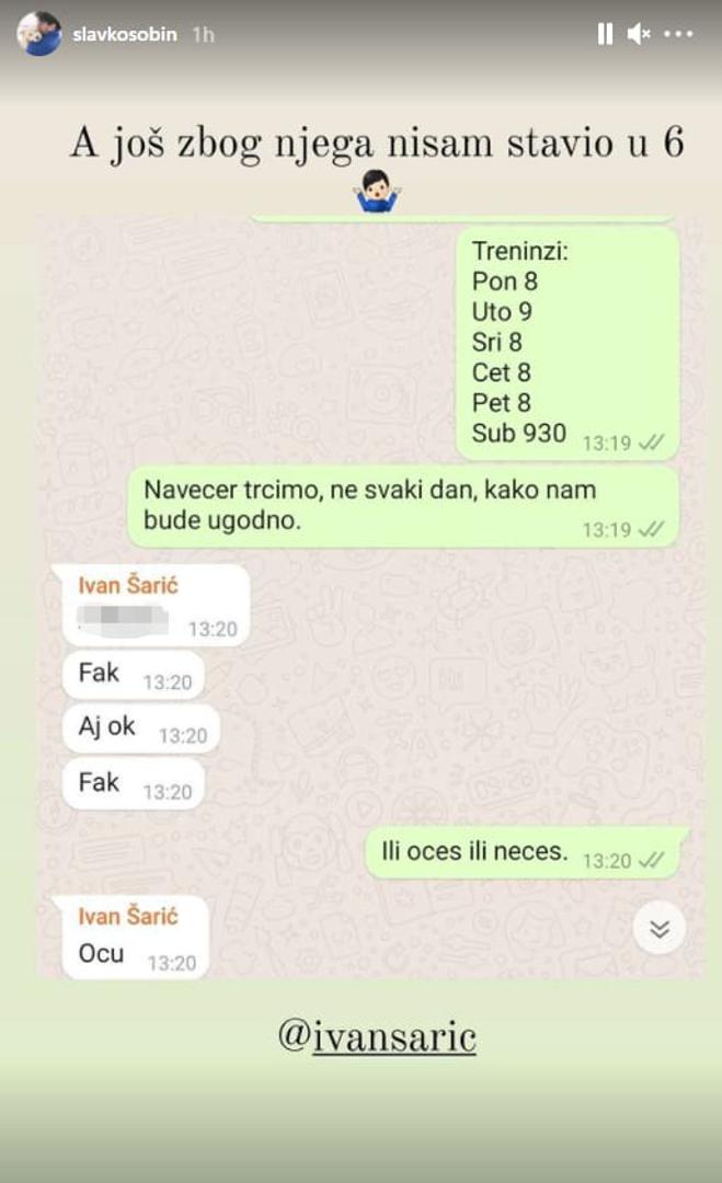 Glumac Slavko Sobin (36) na svojem je Instagram storyju podijelio zanimljivu prepisku razgovora s komičarom Ivanom Šarićem (31). Naime, dvojica prijatelja preko društvenih mreža su se dogovarala kada će ići na trening, a kako obojica imaju drugačije rasporede te preferencije to je bilo dosta teško. Na vrhu fotografije se vidi da je Sobin Šariću napisao kada imaju treninge. Napisao je da bi ponedjeljkom, srijedom, četvrtkom i petkom trenirali u osam sati, dok bi utorkom trening započeli u devet. Subotom bi, pak, u duhu vikenda trening započinjali kasnije nego drugim danima, u 9 i 30. "Navečer trčimo, ne svaki dan, kako nam bude ugodno", završio je plan vježbanja Sobin. Šarić se baš nije činio pretjerano oduševljen rasporedom. "A k*rac. Fak. Aj ok. Fak", odgovorio je djelujući nezadovoljno. Sobin mu se nije htio prilagođavati više, pa mu je samo kratko poručio: "Ili hoćeš ili nećeš". Šarić je na to napisao da želi. Pored prepiske Sobin je napisao jedno svoje razmišljanje. "A još zbog njega nisam stavio u šest", napisao je želeći pokazati svoju obzirnost.
