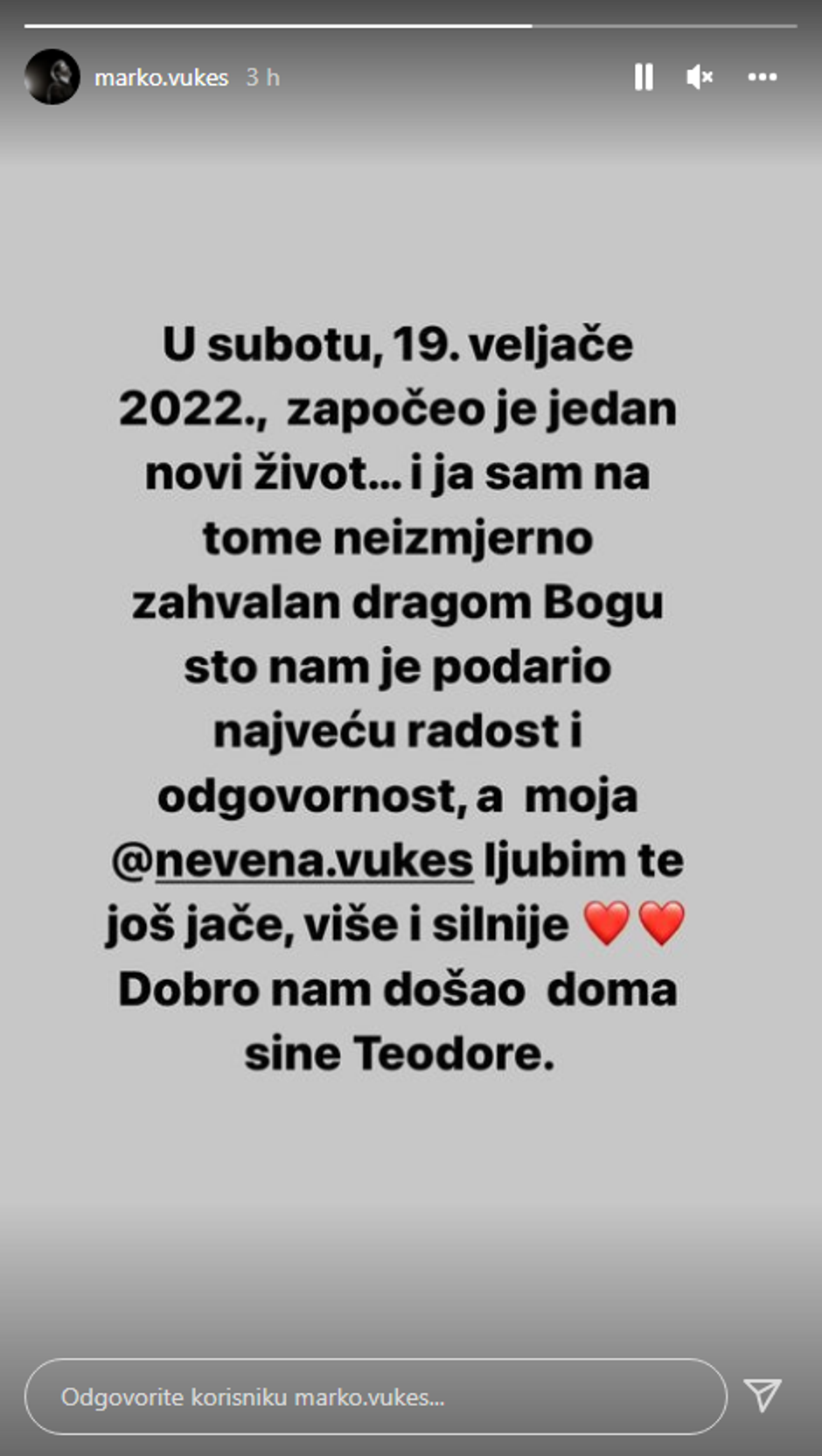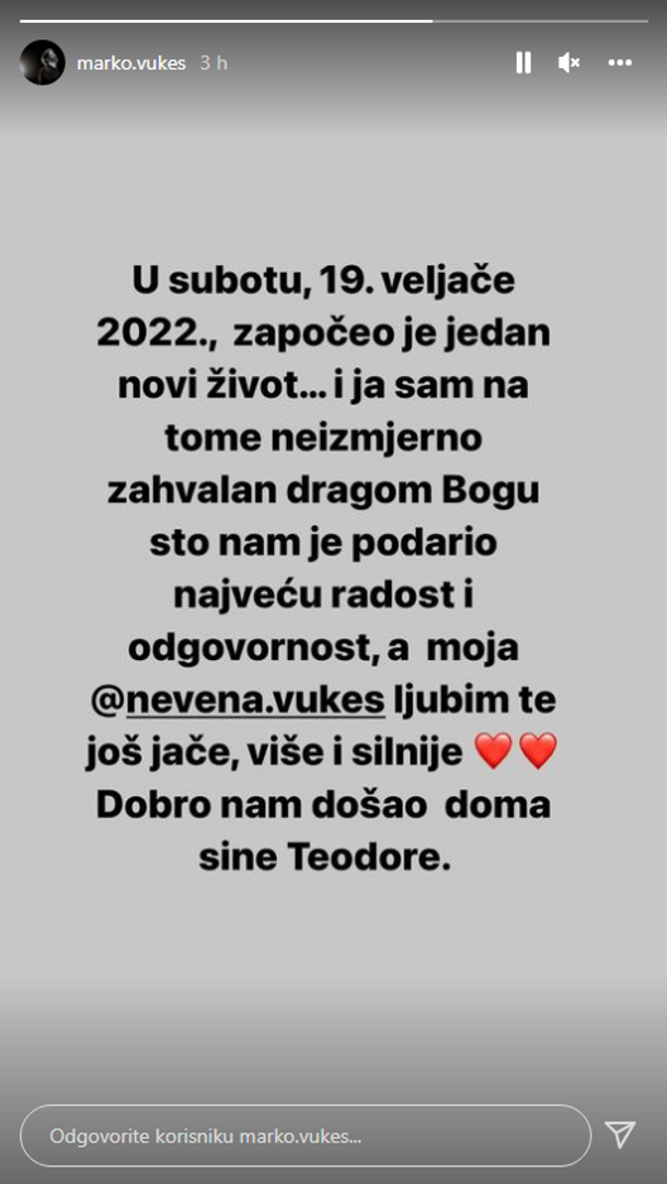- U subotu 19. veljače započeo je jedan novi život i ja sam na tome neizmjerno zahvalan dragom Bogu što nam je podario najveću radost i odgovornost, a moja Nevena ljubim te još jače, više i silnije. Dobro nam došao sine Teodore - napisao je Vukes.