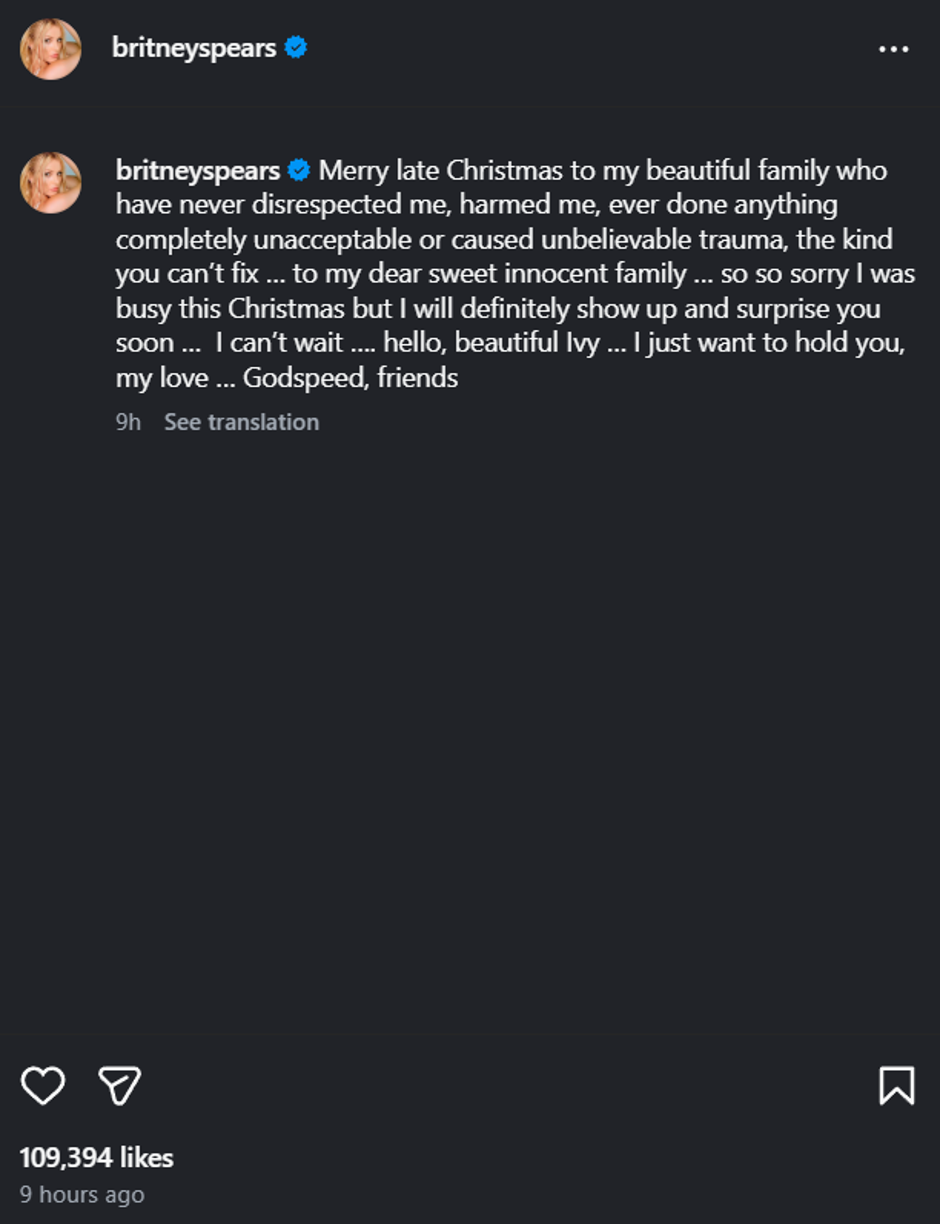 "Sretan zakašnjeli Božić mojoj predivnoj obitelji koja me nikada nije omalovažavala, povrijedila, ikad učinila nešto potpuno neprihvatljivo ili uzrokovala nevjerojatnu traumu, onu vrstu koju ne možete popraviti", započela je Britney. "Mojoj dragoj, slatkoj, nevinoj obitelji... tako mi je žao što sam bila zauzeta ovog Božića, ali definitivno ću se pojaviti i uskoro vas iznenaditi... Jedva čekam", dodala je, a njezina je poruka odmah izazvala lavinu reakcija. Iako je poruka bila oštra, završila je s neočekivanom nježnošću upućenom njezinoj nećakinji: "Zdravo, predivna Ivy... samo te želim držati, ljubavi moja."
