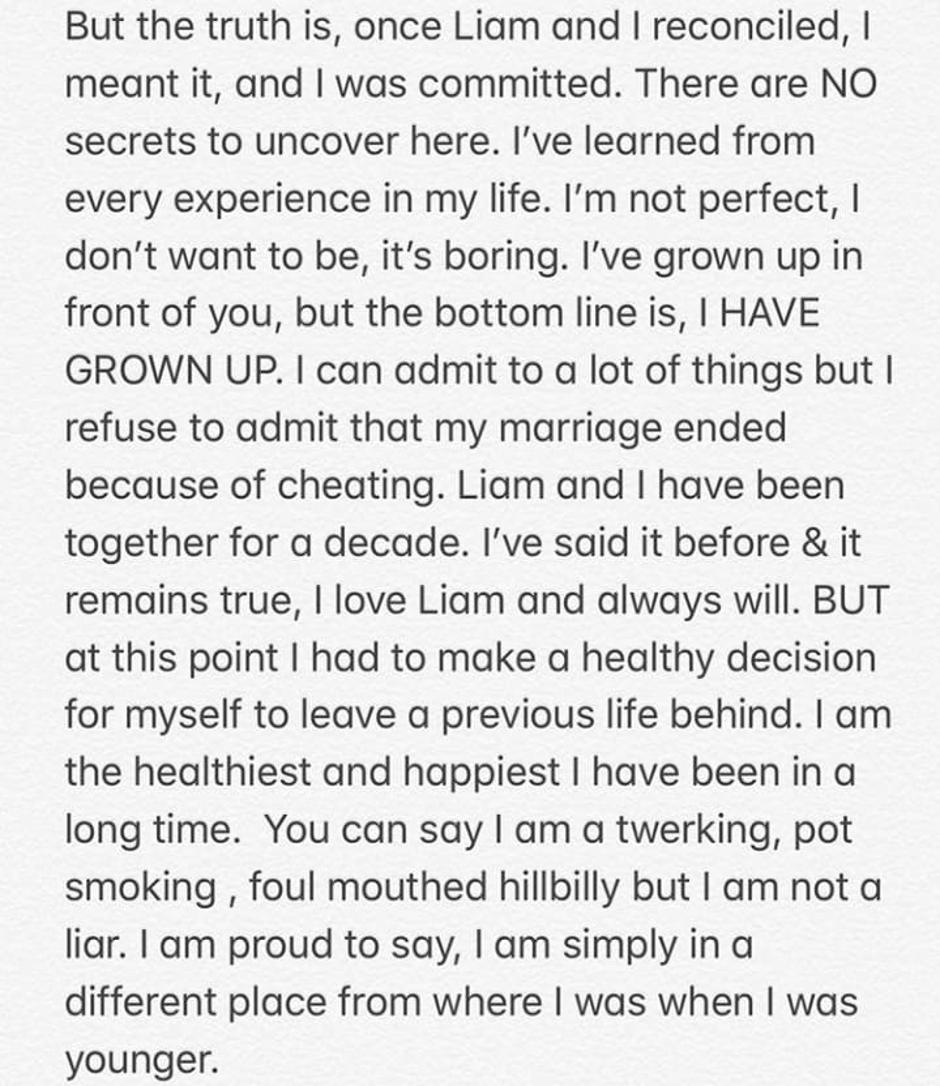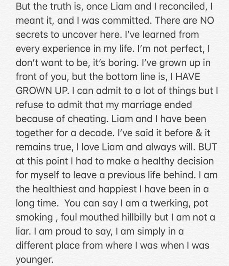 - Jednom kada smo se Liam i ja pomirili, mislila sam to i bila sam odana. Ovdje nema tajni koje treba otkrivati. Naučila sam iz svakog iskustva u životu. Nisam savršena, ne želim biti, dosadno je. Odrasla sam pred vama, ali suština je da, ODRASLA SAM - napisala je.