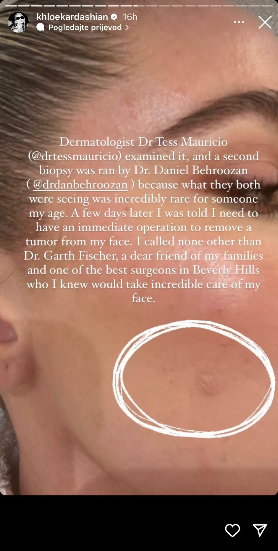 -Nakon što sam primijetila malu kvržicu na svom licu i pretpostavila da se radi o nečem manjem kao što je bubuljica, odlučila sam napraviti biopsiju sedam mjeseci nakon što sam shvatila da ne odlazi. Nekoliko dana kasnije rekli su mi da hitno moram na operaciju uklanjanja tumora s lica- napisala je Khloe uz fotografije koje je podijelila na svom Instagram profilu pa dodala: