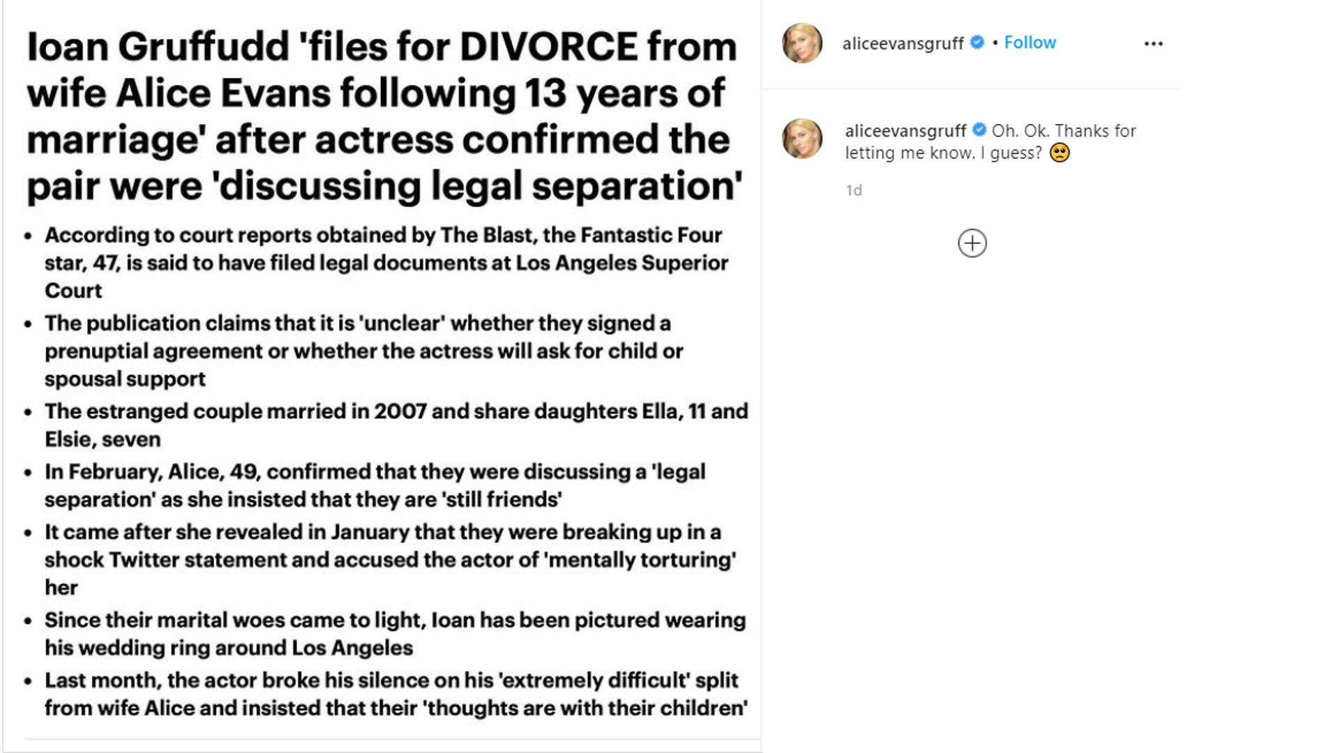 Alice se ponovno oglasila na društvenim mrežama kako bi potvrdila da ona svoje objave nije brisala, već je to učinio njezin suprug koji ima sve lozinke za pristup njezinim privatnim profilima. U komentarima je pojasnila da proživljava teško zlostavljanje već šest mjeseci, te da joj suprug nije htio ponuditi konačan dogovor oko razvoda već je stalno mijenjao mišljenje, te joj govorio: "Da, ne i možda". Podsjetimo, glumica Alice Evans na Twitteru je otkrila da je njezin suprug, glumac Ioan Gruffudd s kojim je bila 20 godina u ljubavnoj vezi, od kojih su 13 proveli u braku, odlučio napustiti svoju obitelj.