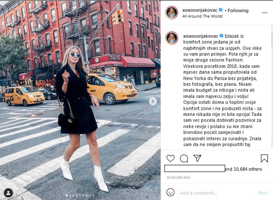 "Izlazak iz komfor zone jedna je od najbitnijih stvari za uspjeh. Ove slike su vam pravi primjer. Pola njih je s moje druge sezone Fashion Weekova početkom 2018. kada sam mjesec dana sama proputovala od New Yorka do Pariza bez prijatelja, bez fotografa, bez plana. Nisam imala budžet za nikoga i ništa, ali imala sam najveću želju i volju! Opcija ostati doma u toplini svoje komfor zone i ne poduzeti ništa – za mene nikada nije ni bila opcija", započela je Sonja pa otkrila kako je sve započelo.