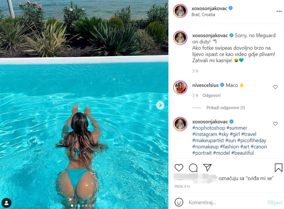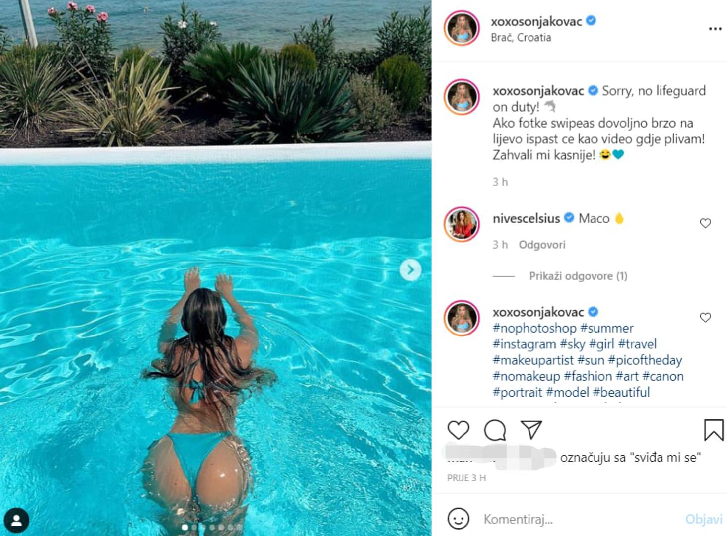 Influencerica Sonja Kovač (37) na svom je Instagram profilu podijelila album fotografija s odmora. Na fotografijama se vidi kako uživa plivajući u bazenu, a leđa je okrenula kameri. „Oprostite, nema spasioca na dužnosti“, napisala je u opisu, a svojim je fanovima rekla i mali savjet. „Ako fotografije swipeaš dovoljno brzo na lijevo, ispast će kao video gdje plivam! Zahvali mi kasnije“, dodala je Kovač.