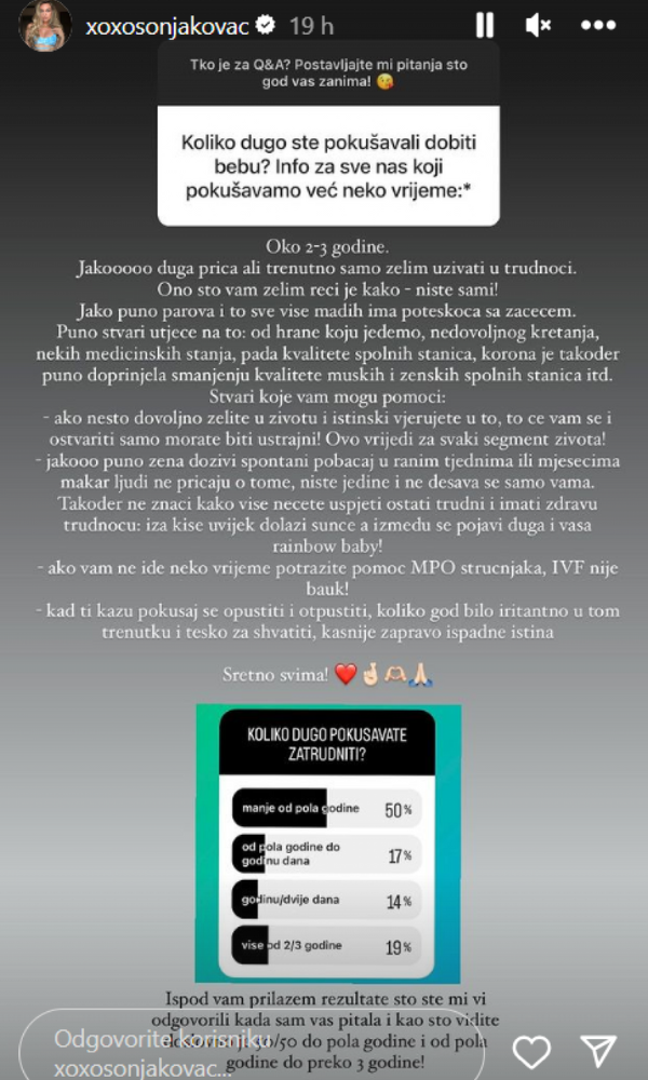 "Koliko dugo ste pokušavali dobiti bebu? Info za sve nas koji pokušavamo već neko vrijeme", glasilo je jedno pitanje. "Oko dvije do tri godine", napisala je Sonja i pojasnila da se radi o jako dugoj priči u koju neće ulaziti jer trenutno želi uživati u trudnoći.