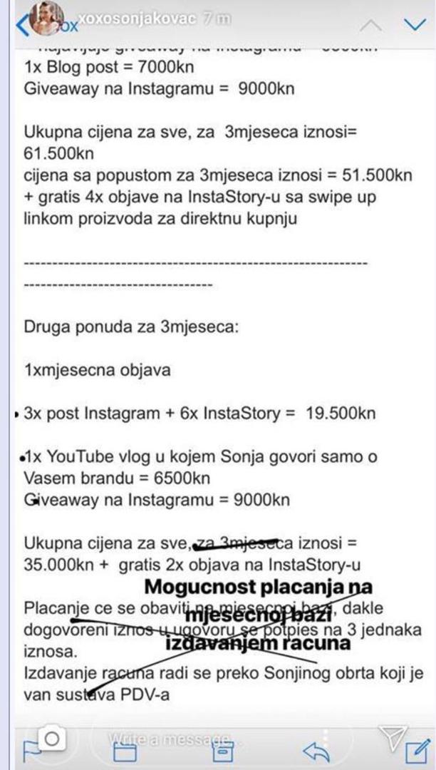 Na Instagramu blogerice i bivše glumice Sonje Kovač (34), koju prati preko 300 tisuća ljudi, nakratko je osvanuo cjenik njezinih usluga na društvenim mrežama. Fotografiju je navodno slučajno objavila javno, umjesto da ju je poslala osobi koja se preko nje htjela oglašavati, pišu 24sata.
