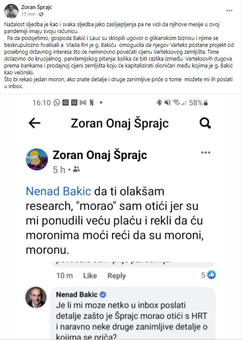 Pa da podsjetimo, gospoda Bakić i Lauc su sklopili ugovor o glikanskom biznisu i njime se beskrupulozno hvalisali, a  Vlada RH je g. Bakiću  omogućila da njegov Varteks postane projekt od posebnog državnog interesa što će neminovno povećati cijenu Varteksovog zemljišta. Time dolazimo do krucijalnog  pandemijskog pitanja: kolika će biti razlika između  Varteksovih dugova prema bankama i prodajnoj cijeni zemljišta koju će kapitalizirati dioničari među kojima je g. Bakić kao većinski. Što bi rekao jedan moron, ako znate detalje i druge zanimljive priče o tome  možete mi ih poslati u inbox - napisao je Šprajc uz screenshot njihove prepiske na društvenim mrežama.