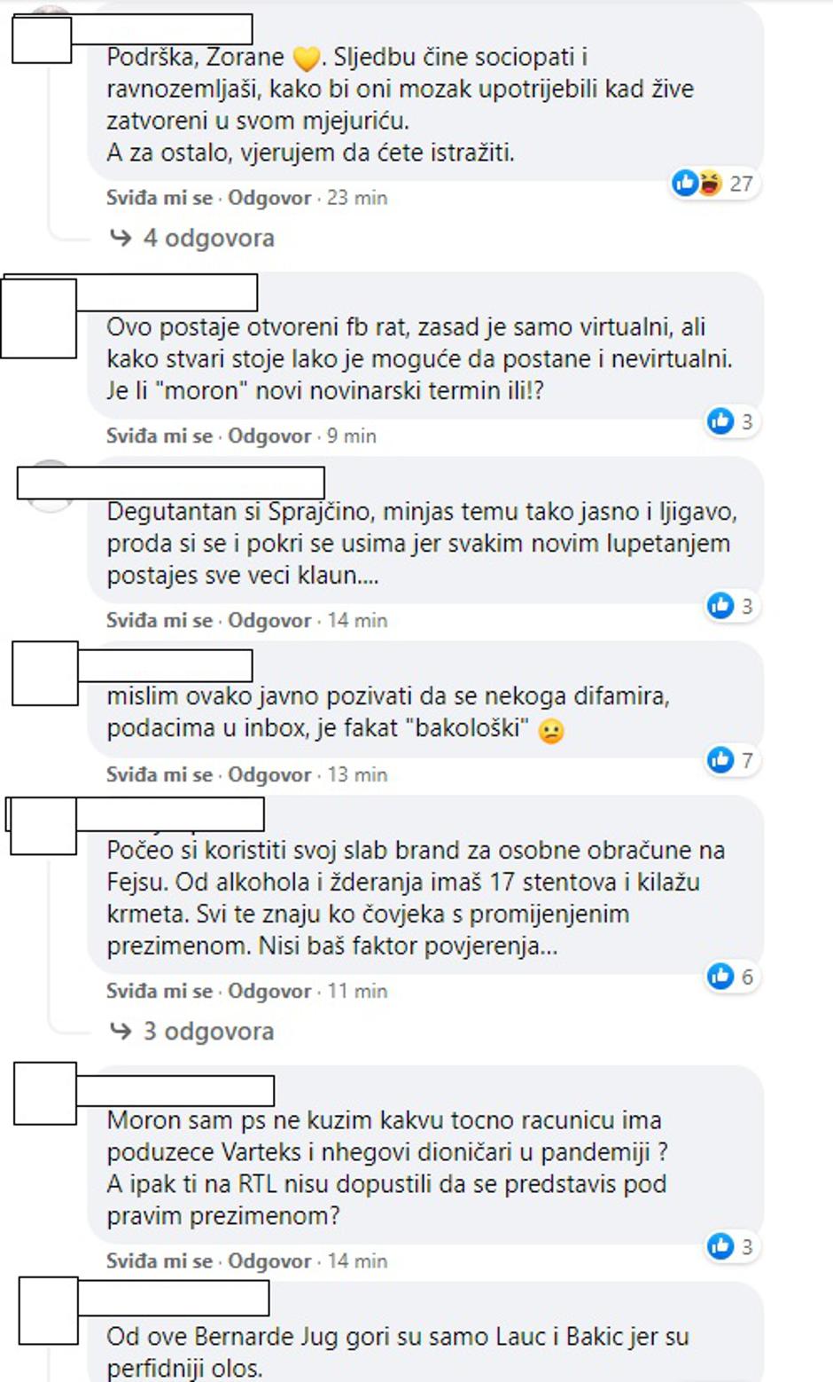 Urednik i voditelj informativne emisije RTL Direkt Zoran Šprajc 'zakačio' se s analitičarem Nenadom Bakićem. Šprajc je naime prvo na svom privatnom Facebook profilu, a potom i na službenoj Facebook stranici objavio  Bakićeve komentare u kojima se on raspituje zašto je Šprajc otišao s javne televizije