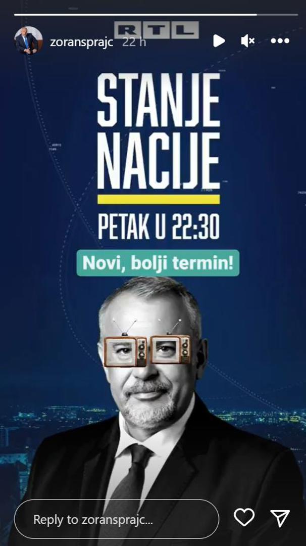 Novinar i urednik Zoran Šprajc u svibnju je na RTL-u predstavio svoju novu emisiju "Stanje nacije". Nakon što smo ga prijašnjih godina gledali gotovo svakog dana u RTL Direktu, Šprajca sada pratimo petkom u emisiji u kojoj još više komentira aktualne teme. Mnogima omiljeni voditelj sada je objavio kako je njegova emisija dobila novi termin.