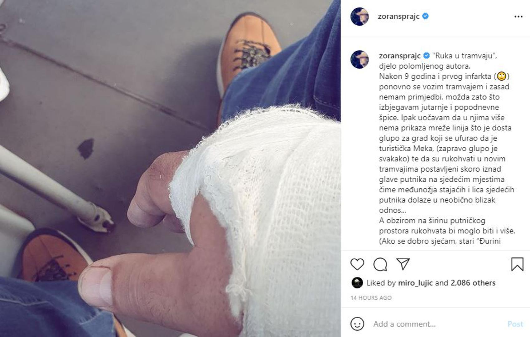 "'Ruka u tramvaju', djelo polomljenog autora. Nakon 9 godina i prvog infarkta ponovno se vozim tramvajem i zasad nemam primjedbi, možda zato što izbjegavam jutarnje i popodnevne špice. Ipak uočavam da u njima više nema prikaza mreže linija što je dosta glupo za grad koji se ufurao da je turistička Meka, (zapravo glupo je svakako) te da su rukohvati u novim tramvajima postavljeni skoro iznad glave putnika na sjedećim mjestima čime međunožja stajaćih i lica sjedećih putnika dolaze u neobično blizak odnos...A obzirom na širinu putničkog prostora rukohvata bi moglo biti i više. (Ako se dobro sjećam, stari 'Đurini tramvaji' imali su po tri reda rukohvata na stropu). No dobro, možda ipak imam primjedbi", napisao je na Instagramu Šprajc.