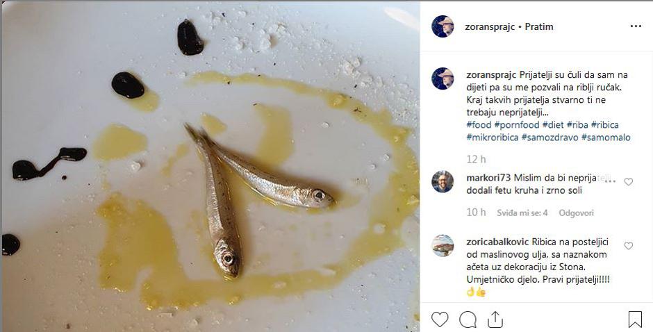 – Sreća da nisi na Jadranu, takva porcija je oko 400 kuna – dodao je drugi u šaljivom tonu drugi aludirajući na cijene koje ovih dana divljaju po turističkim mjestima. Šprajcu su poručili da je ovo ''večera za pet'' i pohvalili smisao za humor njegovih prijatelja.