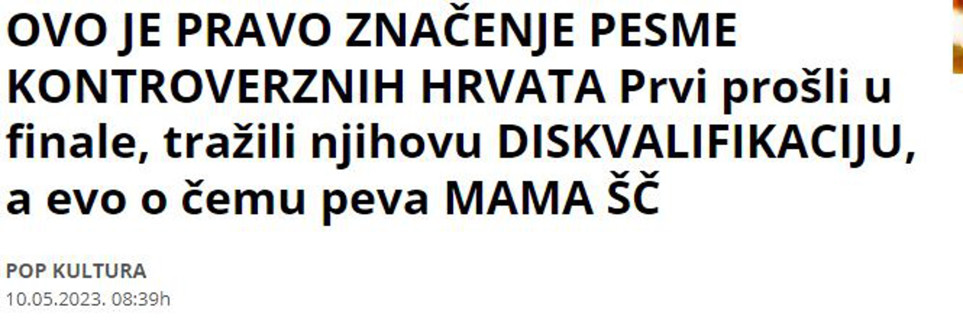 "OVO JE PRAVO ZNAČENJE PJESME KONTROVERZNIH HRVATA Prvi prošli u finale, tražili njihovu DISKVALIFIKACIJU, a evo o čemu pjeva MAMA ŠČ" naslov je koji je nakon nastupa Leta 3 objavio Kurir