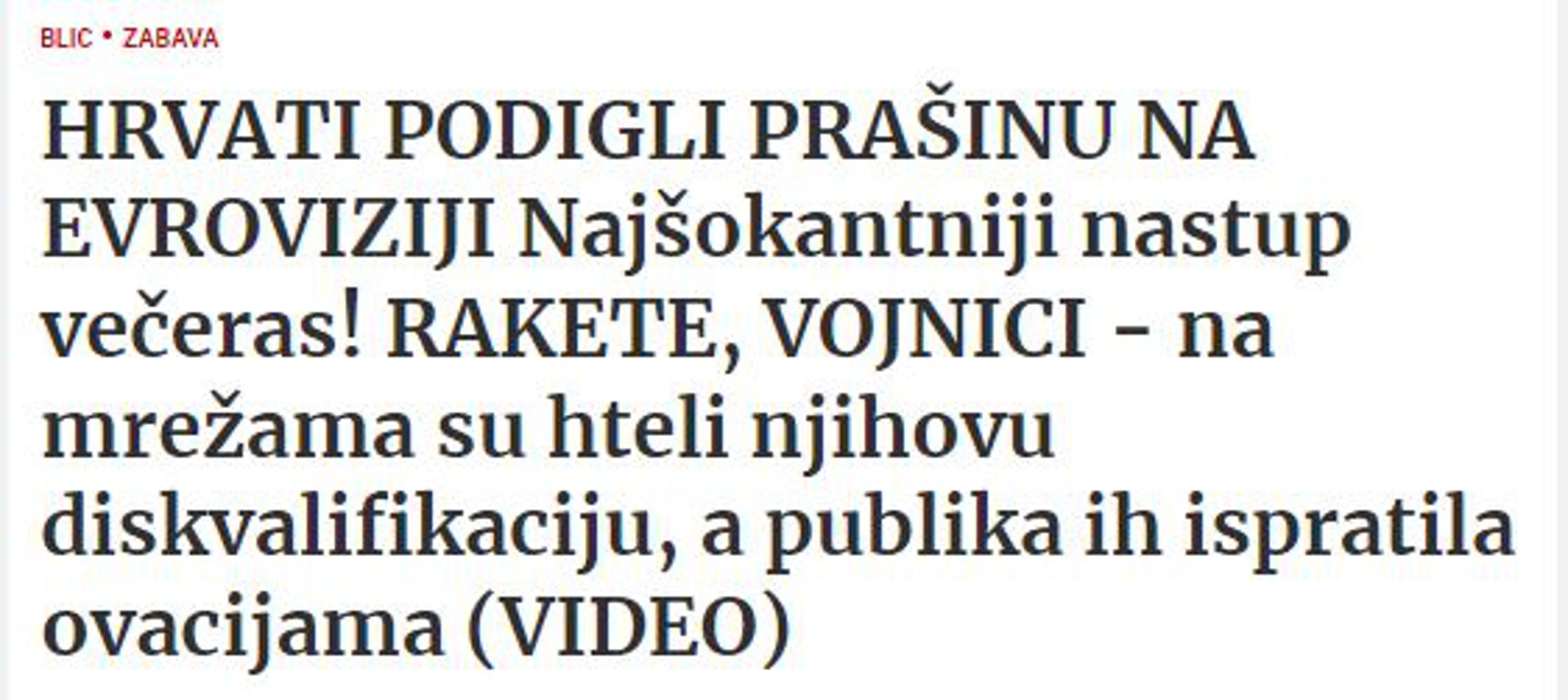 "HRVATI PODIGLI PRAŠINU NA EUROVIZIJI Najšokantniji nastup večeras! RAKETE, VOJNICI – na mrežama su htjeli njihovu diskvalifikaciju, a publika ih ispratila ovacijama (VIDEO)" naslov je na portalu Blic.rs.