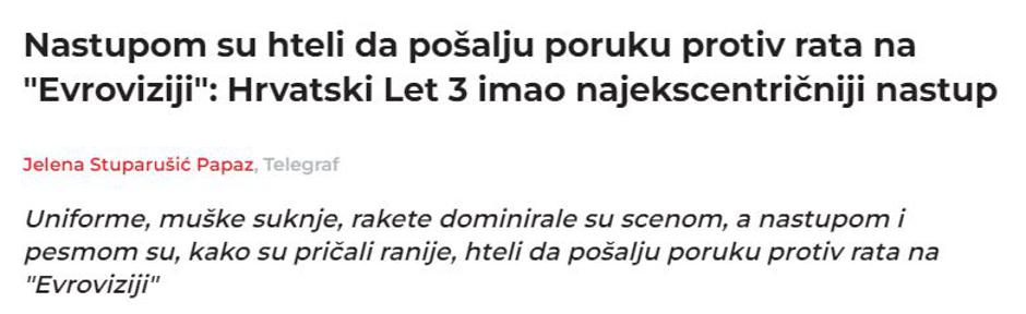 "Nastupom su htjeli poslati poruku protiv rata na 'Euroviziji': Hrvatski Let 3 imao najekscentričniji nastup" piše Telegraf