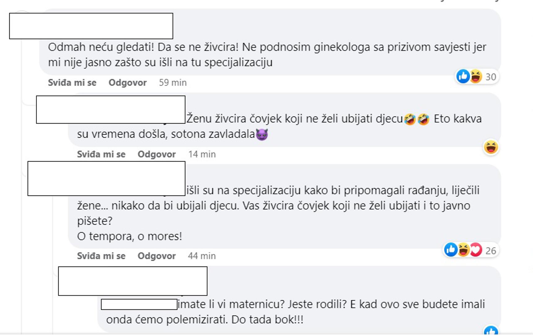 "Odmah neću gledati! Da se ne živcira! Ne podnosim ginekologa sa prizivom savjesti jer mi nije jasno zašto su išli na tu specijalizaciju", "Već sam naživcirana", pisali su neistomišljenici.