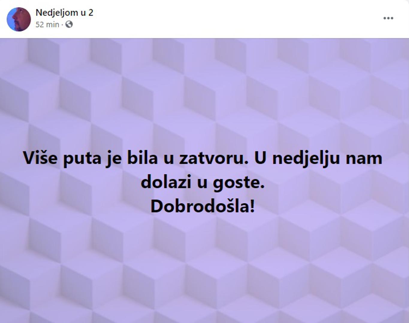 Aleksandar Stanković na službenoj je stranici emisije "Nedjeljom u 2" zaintrigirao pratitelje najavom idućeg gosta. HRT-ov urednik nije otkrio o kome se radi, ali je naznačio kako mu u goste dolazi misteriozna gošća koja je bila u zatvoru.