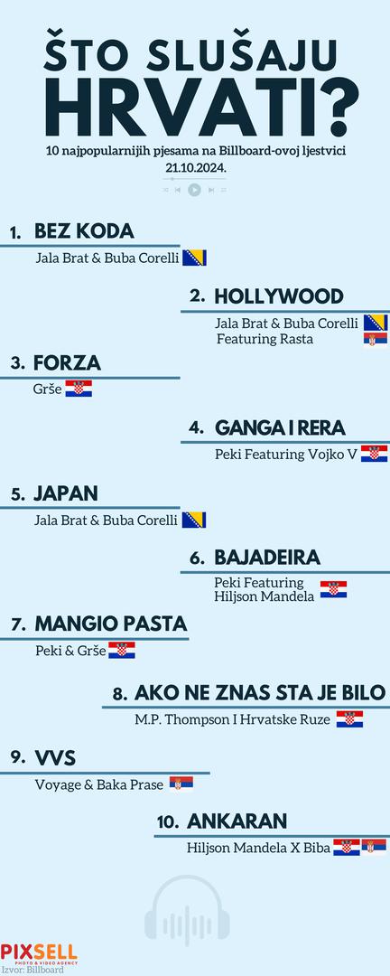 Infografika prikazuje top 10 najslušanijih pjesama u Hrvatskoj prema Billboardovoj ljestvici 2024. Prva dva mjesta zauzimaju Jala Brat i Buba Corelli, treće mjesto pripada Grši i njegovoj pjesmi "Forza", a na desetom je mjestu Hiljson Mandela X Biba s pjesmom "Ankaran" Photo: Marko Picek/PIXSELL