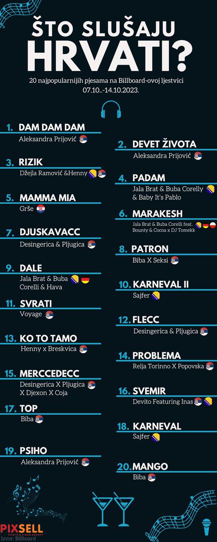 Ne iznenađuje što će Aleksandra Prijović u Areni Zagreb održati pet koncerata, jer upravo je ona na prvom mjestu na Billboardovoj listi najslušanije glazbe ovoga tjedna u Hrvatsko. Njezina pjesma "Dam dam dam" je najslušanija u Hrvatskoj u zadnjih sedam dana. Na drugom mjestu je također Aleksandra s pjesmom "Devet života", a na trećem mjestu je pjesma "Rizik" Džejle Ramović iz BiH i srpskog repera Hennyja. Jala Brat i Buba Corelli iz BiH zauzeli su na ovoj listi slušanosti četvrto mjesto s pjesmom "Padam", dok se na petom mjestu nalazi jedini Hrvat i to je Grše sa svojim ljetnim hitom "Mamma mia".