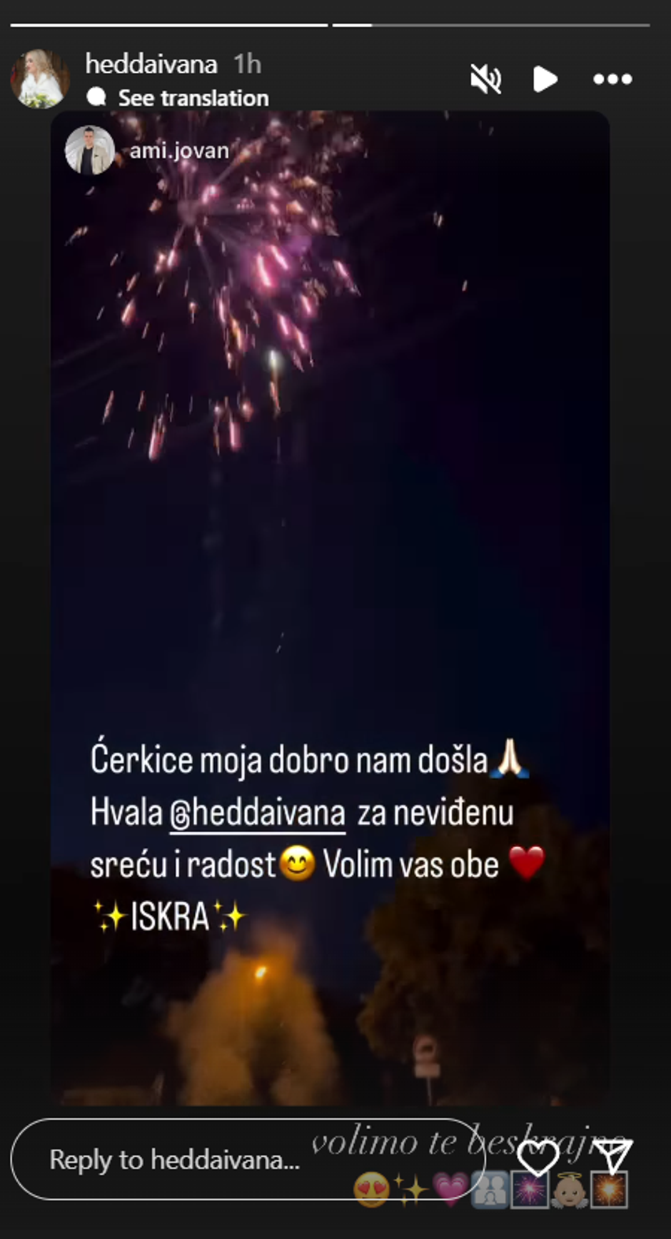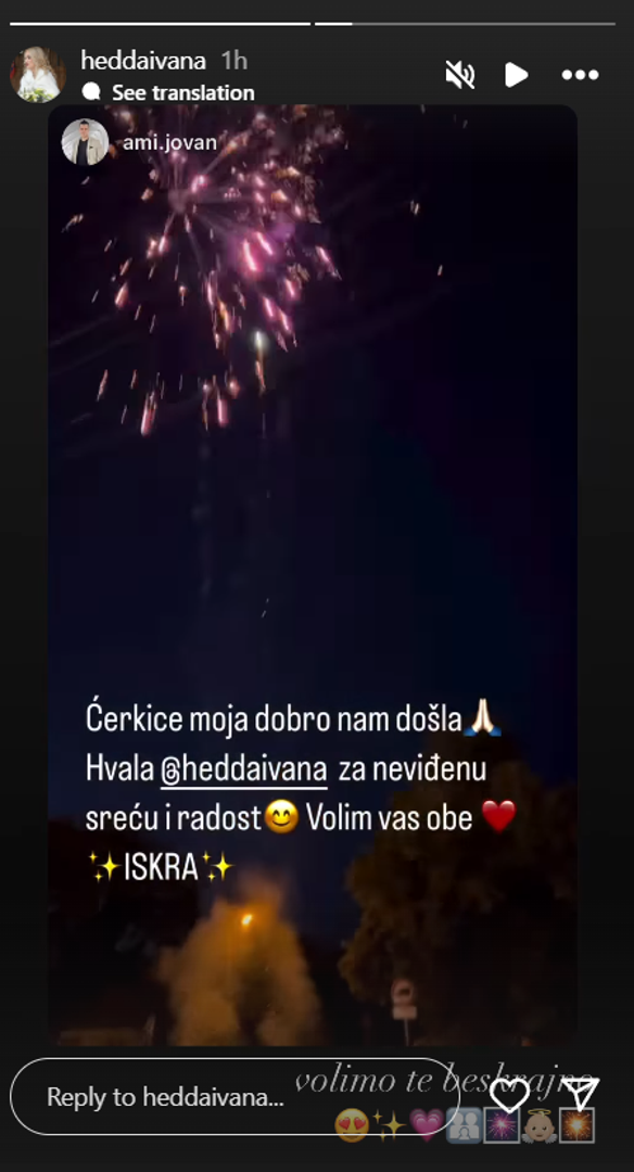 Hedviga Tandara Amidžić iz popularnog reality showa 'Brak na prvu' postala je majka. Njezin suprug Jovan Amidžić objavio je radosnu vijest na društvenim mrežama, uz emotivnu poruku i snimku vatrometa. "Kćerkice moja, dobro nam došla. Hvala, Hedviga za neviđenu sreću i radost. Volim vas obje", napisao je.