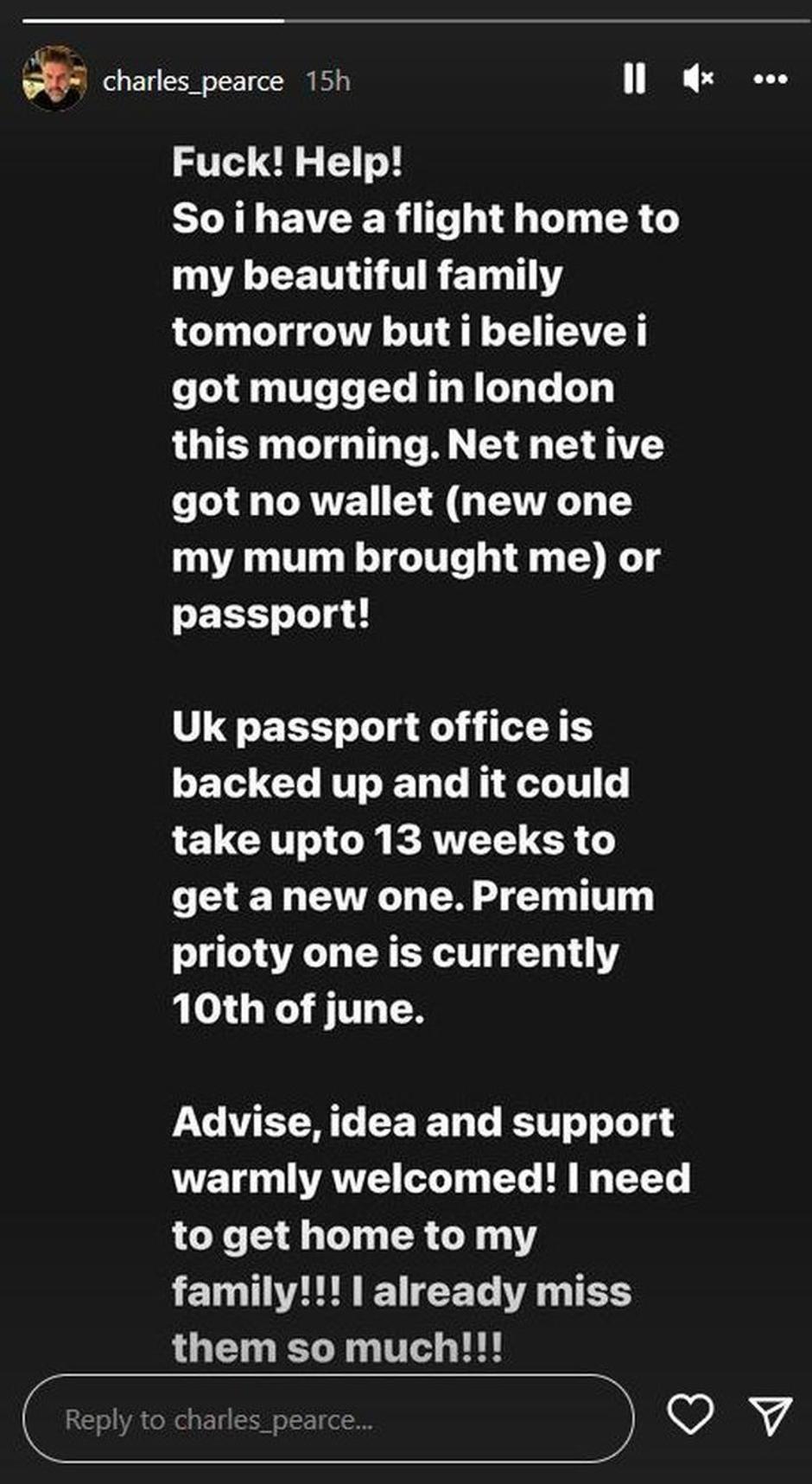 "Sutra imam povratni let za Hrvatsku da se vratim svojoj prelijepoj obitelji, ali vjerujem kako su me jutros u Londonu opljačkali. Nemam novčanik (novi, koji mi je majka kupila) niti putovnicu, a britanski ured za izdavanje putovnica je zakrčen i moglo bi proći čak 13 tjedana prije nego što mi se izradi nova", požalio se Pearce.