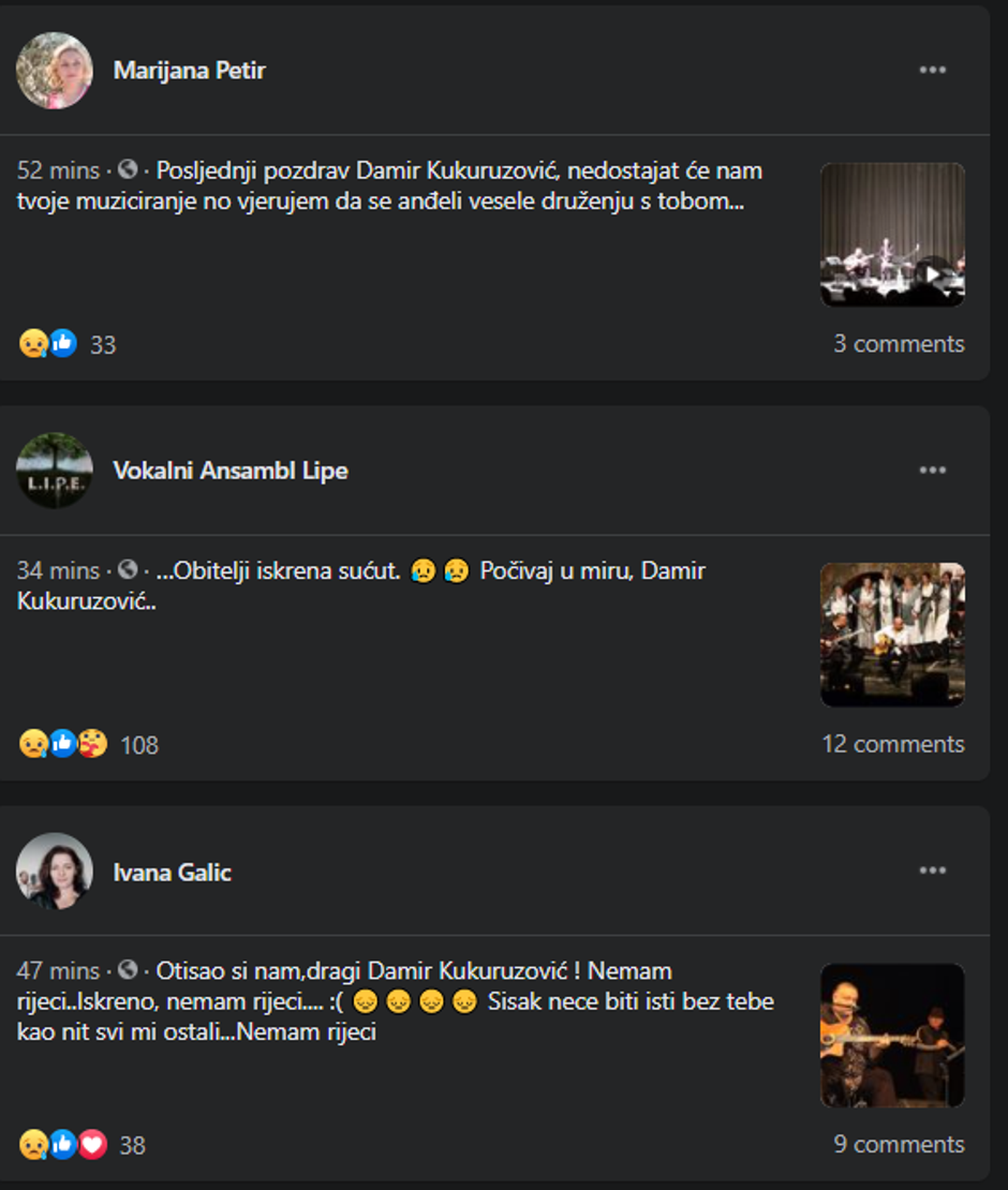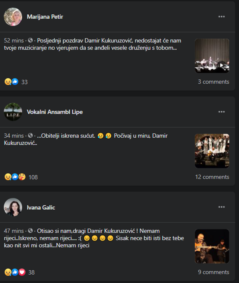 Danas je u 45. godini života nakon višetjedne borbe s koronavirusom bitku za život izgubio poznati Siščanin i jazz gitarist Damir Kukuruzović. Posljednjih sat vremena mnogobrojni korisnici društvenih mreža, među ostalim njegovi kolege i suradnici te fanovi izražavaju sućut, a jedna od njih je i saborska zastupnica Marijana Petir.