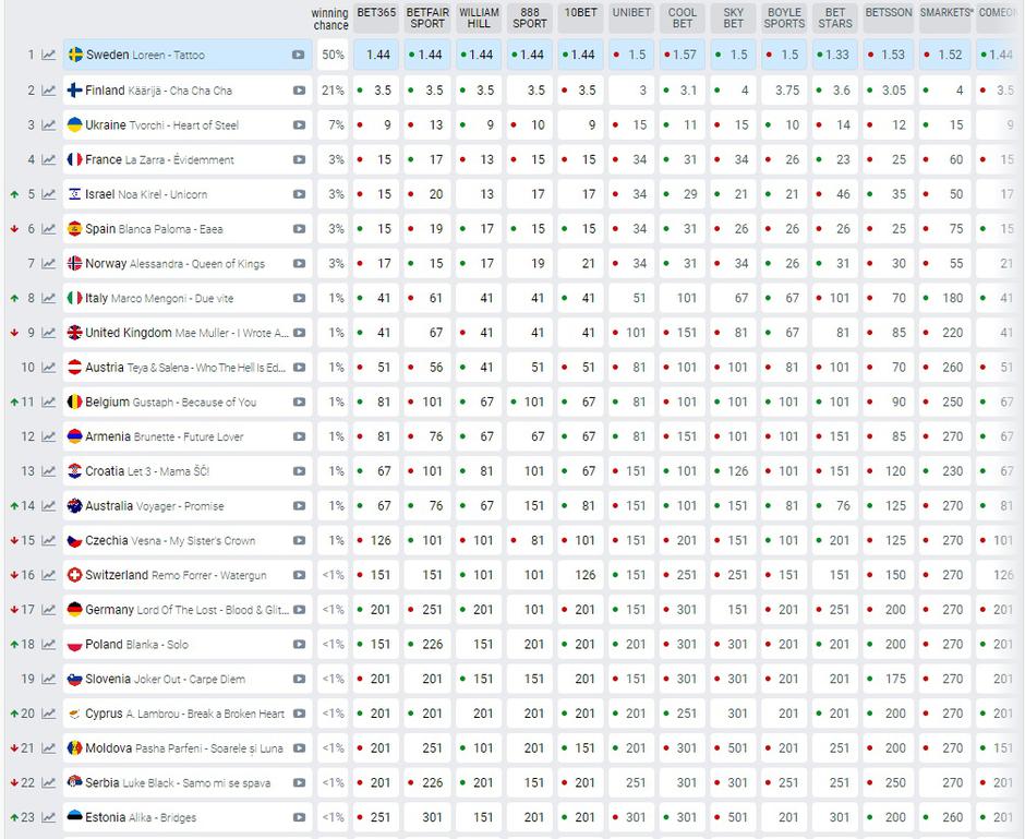 Stanje na eurovizijskim kladionicama mijenja se iz dana u dan, borba je neizvjesna, no i dan uoči velikog finala nije došlo do nekih prevelikih promjena, barem kada je u pitanju sam vrh ljestvice. Najviše šanse za pobjedu kladionice daju Švedskoj koju predstavlja bivša eurovizijska predstavnica Loreen s pjesmom ''Tattoo''. Iza nje je Finska, potom Ukrajina, dalje slijede Francuska, Izrael, Španjolska, Norveška... Među prvih 10 našle su se i Italija, Velika Britanija i Austrija, dok grupi Let 3 kladionice predviđaju 13. mjesto u finalu. Slovenci su trenutačno na 19. mjestu, a Srbi na 22.