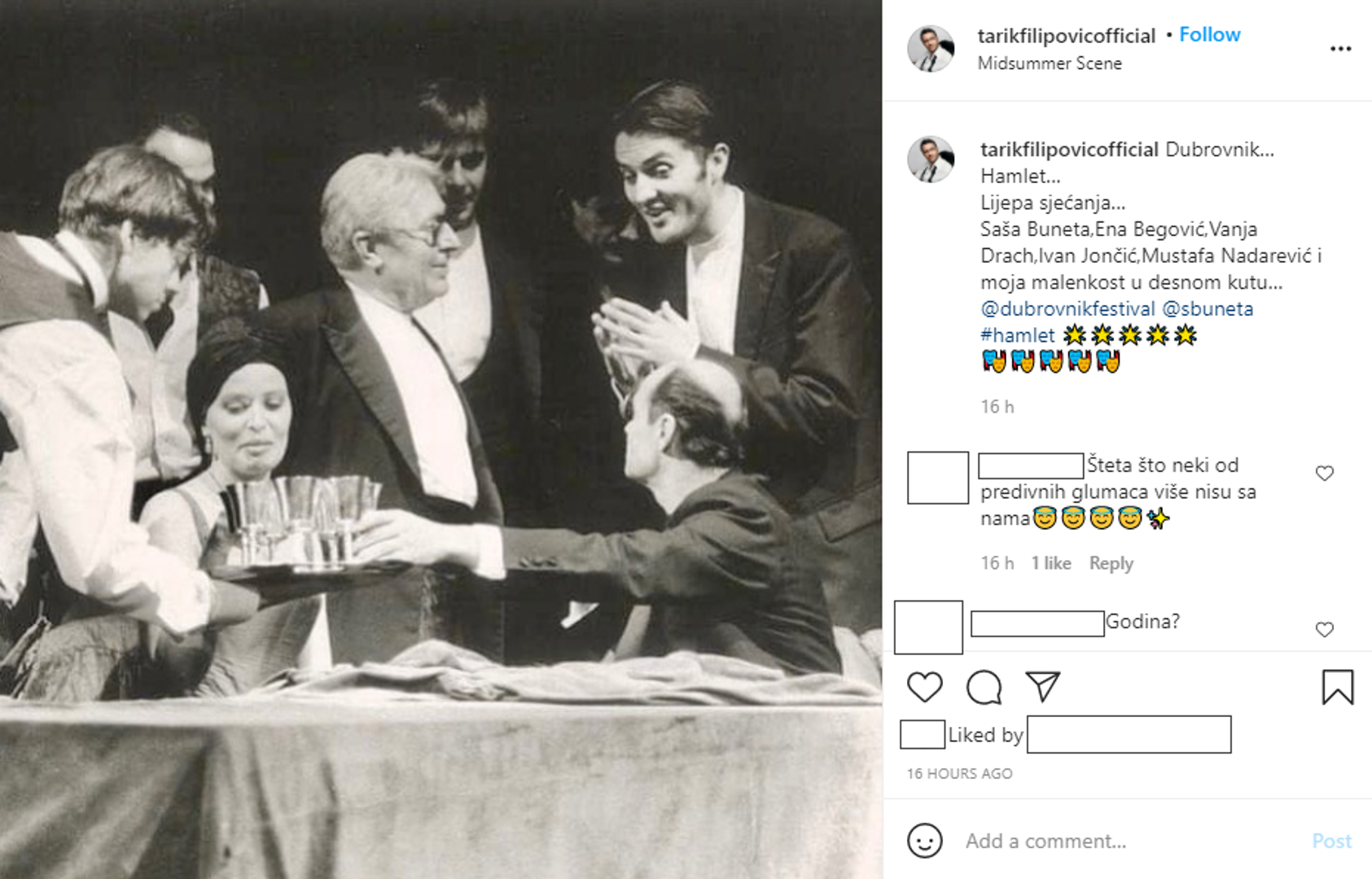 Glumac i voditelj Tarik Filipović (49) na svojem je Instagram profilu podijelio jednu uspomenu. Naime, Filipović je podijelio fotografiju iz jednog starog angažmana na Dubrovačkim ljetnim igrama. Radi se o predstavi 'Hamlet' u kojoj je glumio s mnogim poznatim kolegama te je objavio crno-bijelu fotografiju s te predstave. "Dubrovnik... Hamlet... Lijepa sjećanja", napisao je glumac u opisu fotografije na kojoj se nalazi sa Sašom Bunetom, Ivanom Jončićem te pokojnima Enom Begović, Mustafom Nadarevićem i Vanjom Drach.