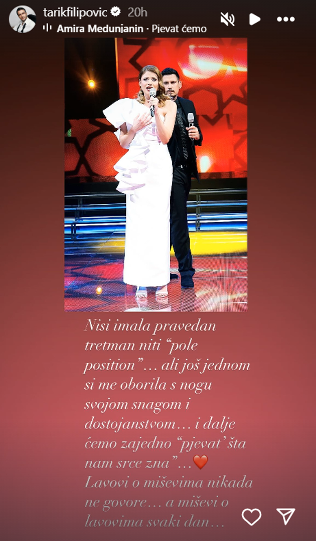 - Nisi imala pravedan tretman niti "pole position". Ali još jednom si me oborila s nogu svojom snagom i dostojanstvom. I dalje ćemo zajedno "pjevat‘ što nam srce zna" - napisao je glumac i dodao: - Lavovi o miševima nikad ne govore. A miševi o lavovima svaki dan... - dodao je i napisao "Bravo ljubavi".