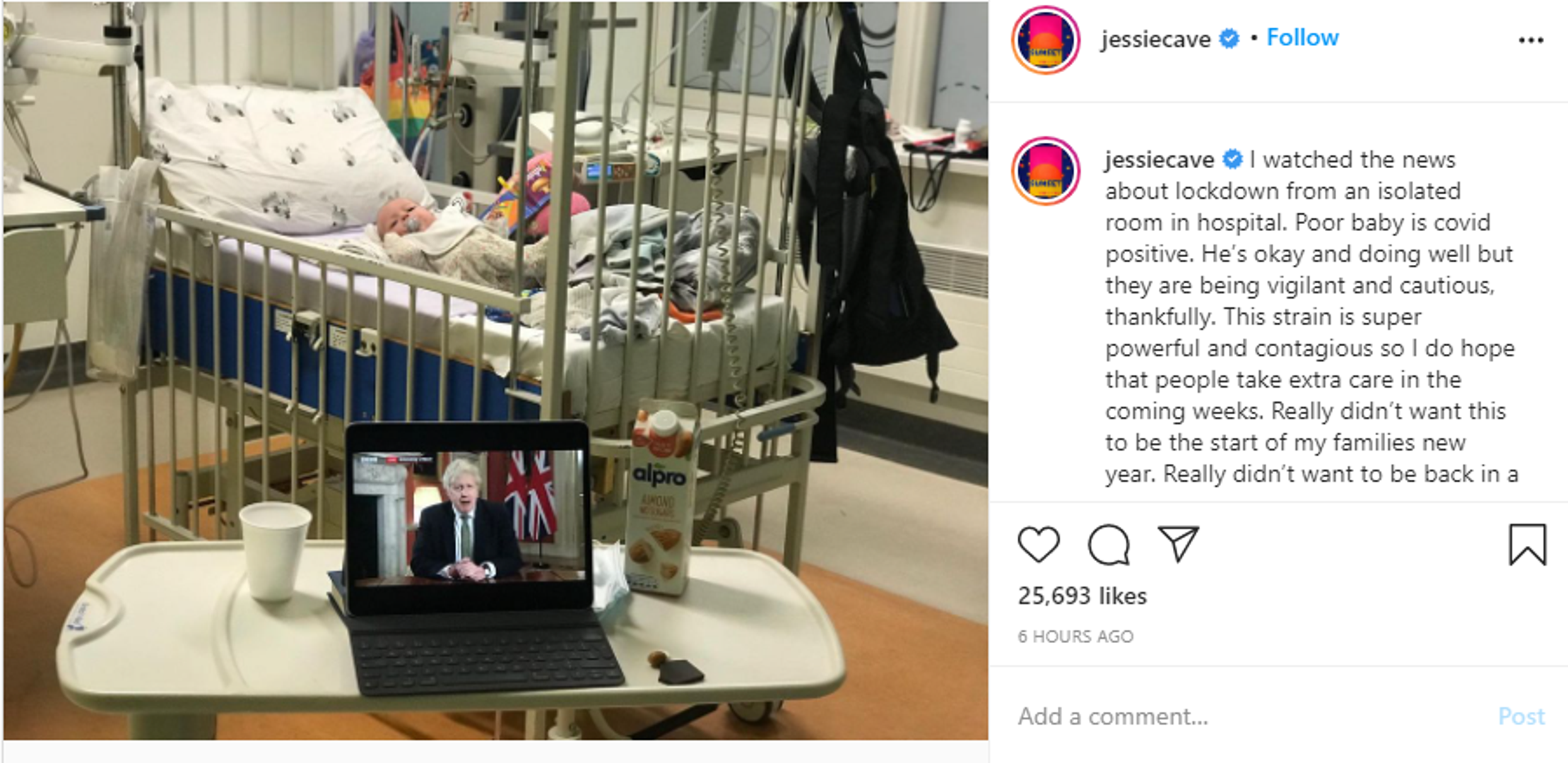 "Novosti o lockdownu gledam iz izolirane bolničke sobe. Moja jadna beba je pozitivna na covid. Dobro mu je, srećom, ali liječnici su na oprezu. Ovaj soj virusa je jako moćan i zarazan pa se nadam da se ljudi posebno brinu za sebe. Zaista nisam htjela da mojoj obitelji ovako započne godina. Baš se nisam željela vratiti u bolnicu toliko brzo nakon traumatičnog porođaja", napisala je glumica uz fotografiju iz bolnice.