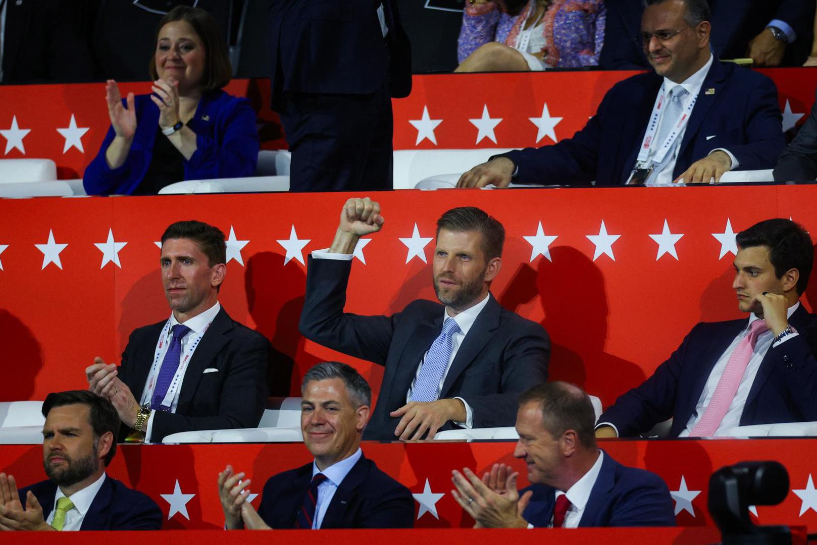 Eric Trump raises his fist as his wife Republican National Committee Co-Chair Lara Trump speaks during Day 2 of the Republican National Convention (RNC), at the Fiserv Forum in Milwaukee, Wisconsin, U.S., July 16, 2024. REUTERS/Brian Snyder Photo: BRIAN SNYDER/REUTERS