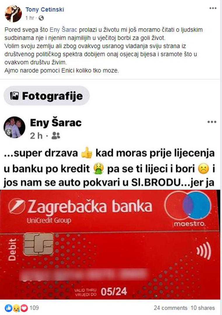 - Super država kad moraš prije liječenja u banku po kredit. Pa se ti liječi i bori i još nam se auto pokvari u Slavonskom Brodu... jer ja sam srećković, naravno sporokucajući - napisala je Ena na svom profilu objavu koju je prenio pjevač te prokomentirao.