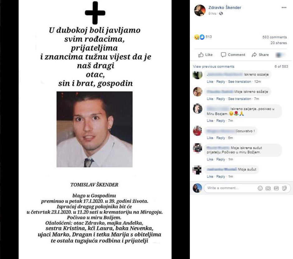 – U dubokoj boli javljamo svim rođacima, prijateljima i znancima tužnu vijest da je naš dragi otac, sin i brat, gospodin Tomislav Škender preminuo u petak 17. siječnja 2020. u 39. godini života. Ispraćaj dragog pokojnika bit će u četvrtak 23. siječnja u 11.20 sati na krematoriju na Mirogoju – stoji u osmrtnici koju je Zdravko objavio na profilu.