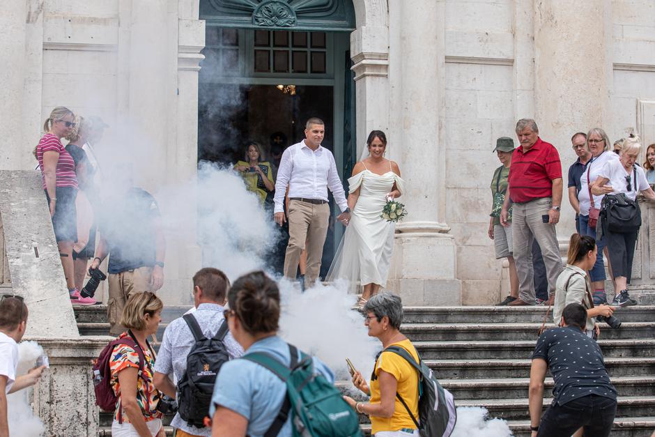 – Bilo je divno, čak nam nije smetalo ni to što nije bilo sunca. Antonio i ja odlučili smo imati malo vjenčanje baš da izbjegnemo stres. Mislim da je najnervozniji bio moj prijatelj Nikola Vikić Topić koji je zbog nas morao gledati satelite svakih sat vremena. Bilo je najavljeno užasno nevrijeme, a nakon kiše koja je lijevala cijelo jutro imali smo sreću da se sve razvedrilo tik pred misu – otkriva za Večernji list Marija. Novopečene mladence prijatelji su iznenadili spektakularnom bakljadom koja ih je dočekala na izlazu iz crkve, ali i nastupom klape Kaše. – Mislim da je strancima na Stradunu bilo top – govori Pajić koja od jučer uz svoje prezime ponosno nosi i suprugovo. – Živim sa svojim prezimenom već 35 godina i ne mogu ga se tako lako odreći, ali uz svoje sam dodala i njegovo – otkrila nam je novinarka.