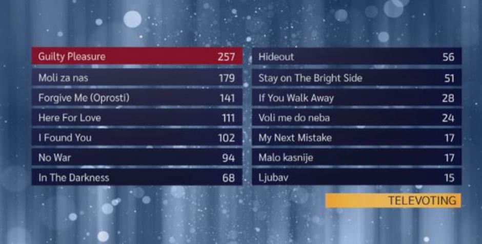 Nakon glasova iz Zagreba, najviše bodova i ima Mia Dimšić, njih čak 91. Samo 10 bodova manje ima pjesma Forgive Me, Mije Negovetić. Mila Elegović nakon glasova stručnih žirija na zadnjem je mjestu i ima samo tri boda.