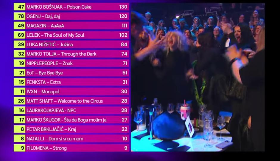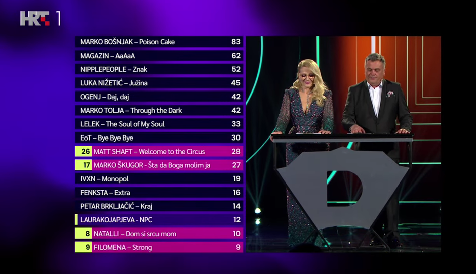 22:17 Slušamo glasove stručnih žirija. Slovenci su 12 bodova dali Marku Bošnjaku. Riječki žiri dao je 12 bodova Marku Tolji. Španjolski žiri 12 bodova dao je Marku Bošnjaku. Splitski žiri dao je 12 bodova Magazinu. Žiri iz Armenije dao je 12 bodova IVXN-u. Osječki žiri dao je 12 bodova Marku Bošnjaku. Finski žiri dao je 12 bodova Marku Bošnjaku. Zagrebački žiri dao je 12 bodova Magazinu.