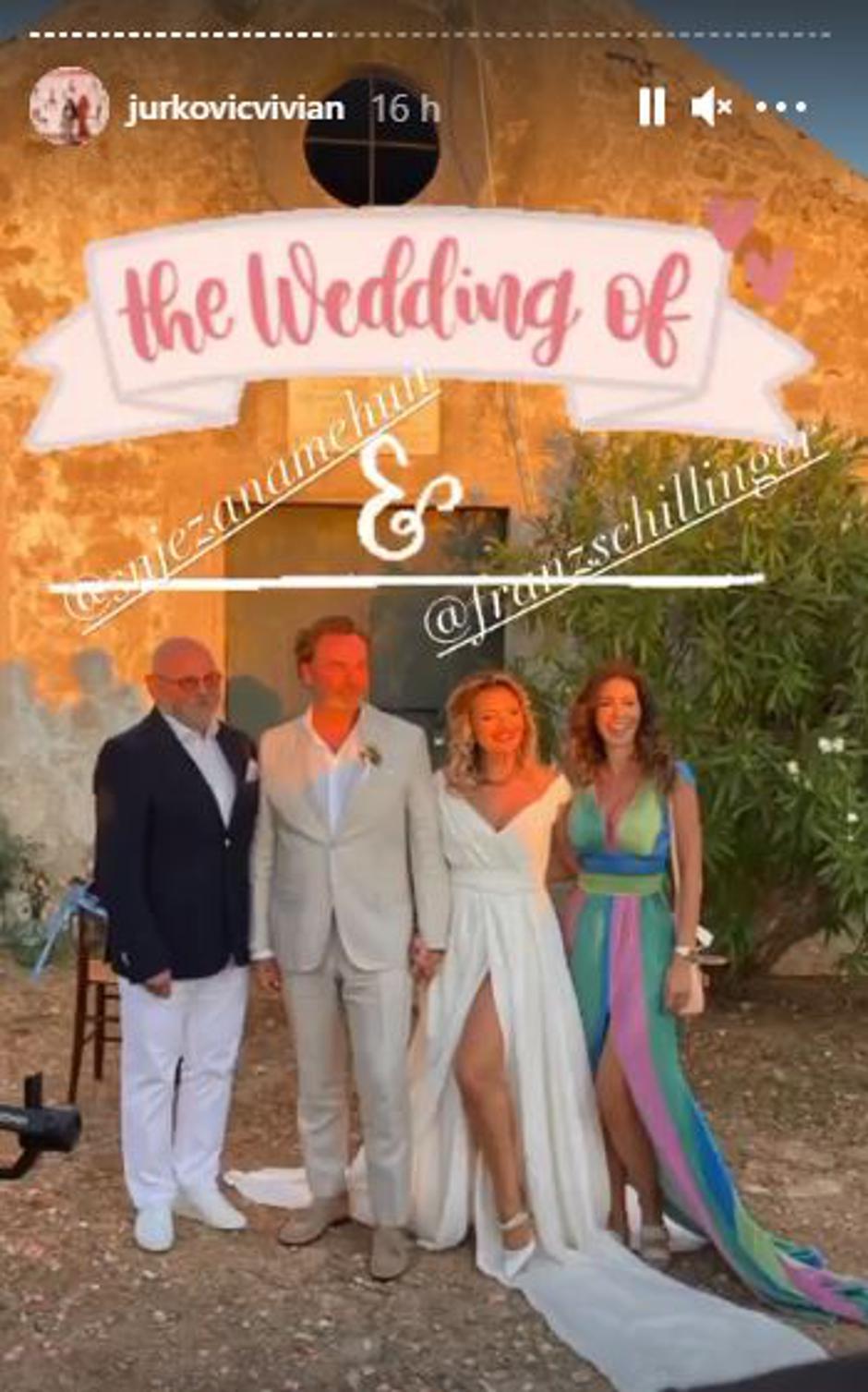 Naša poduzetnica i vlasnica modnog brenda Duchess Snježana Mehun (50) udala se za svog partnera Franza Schillingera na Kornatima. Sudbonosno ''da'' izrekli su u krugu obitelji i prijatelja, a brojni poznati uzvanici na društvenim mrežama podijelili su fotografije i snimke mladenaca koji su pozirali ispod austrijske zastave. Uz njih su cijelo vrijeme bili i ponosni kumovi, a u tim su se laskavim titulama našli njihovi bliski prijatelji Zlatko Mateša i Antea Kodžoman.
