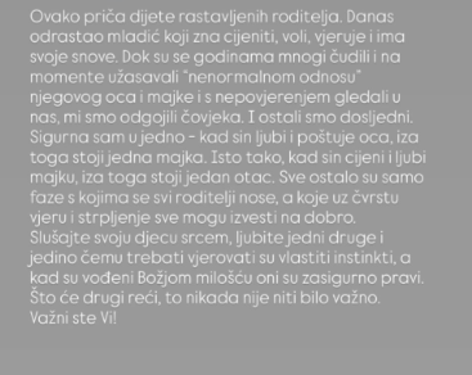 "Sigurna sam u jedno - kad sin ljubi i poštuje oca, iza toga stoji jedna majka. Isto tako, kad sin cijeni i ljubi majku, iza toga stoji jedan otac. Sve ostalo su samo faze s kojima se svi roditelji nose, a koje uz čvrstu vjeru i strpljenje sve mogu izvesti na dobro. Slušajte svoju djecu srcem, ljubite jedni druge i jedino čemu trebate vjerovati su vlastiti instinkti, a kad su vođeni Božjom milošću oni su zasigurno pravi. Što će drugi reći, to nikada nije niti bilo važno. Važni ste Vi!“, nadovezala se.