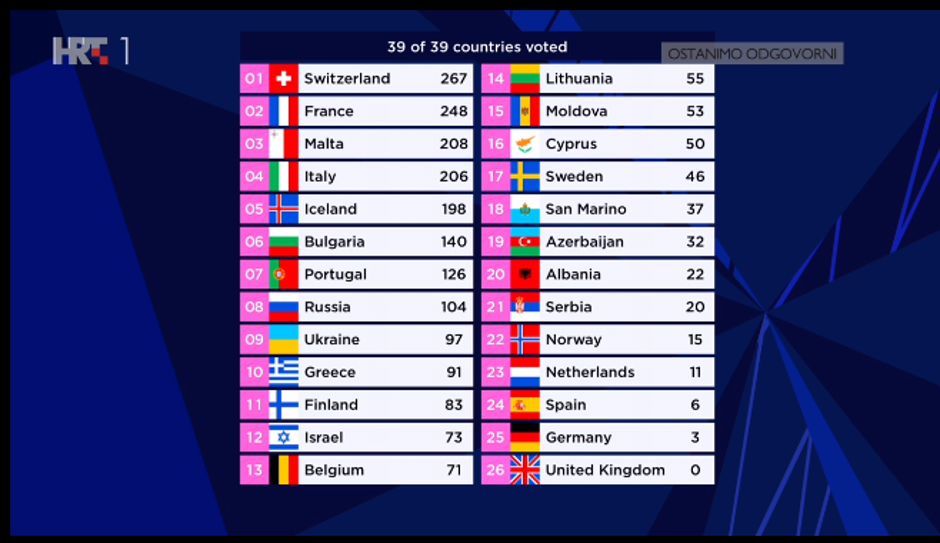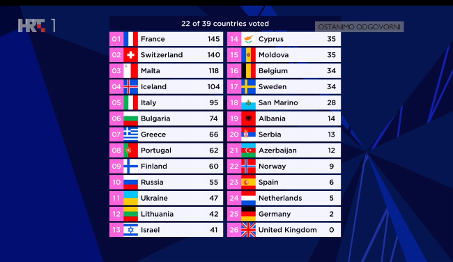 Nakon što su zbrojeni glasovi žirija 22 nacije, ovako izgleda tablica. Francuska, Švicarska i Malta čine uvjerljiv vodeći trio.