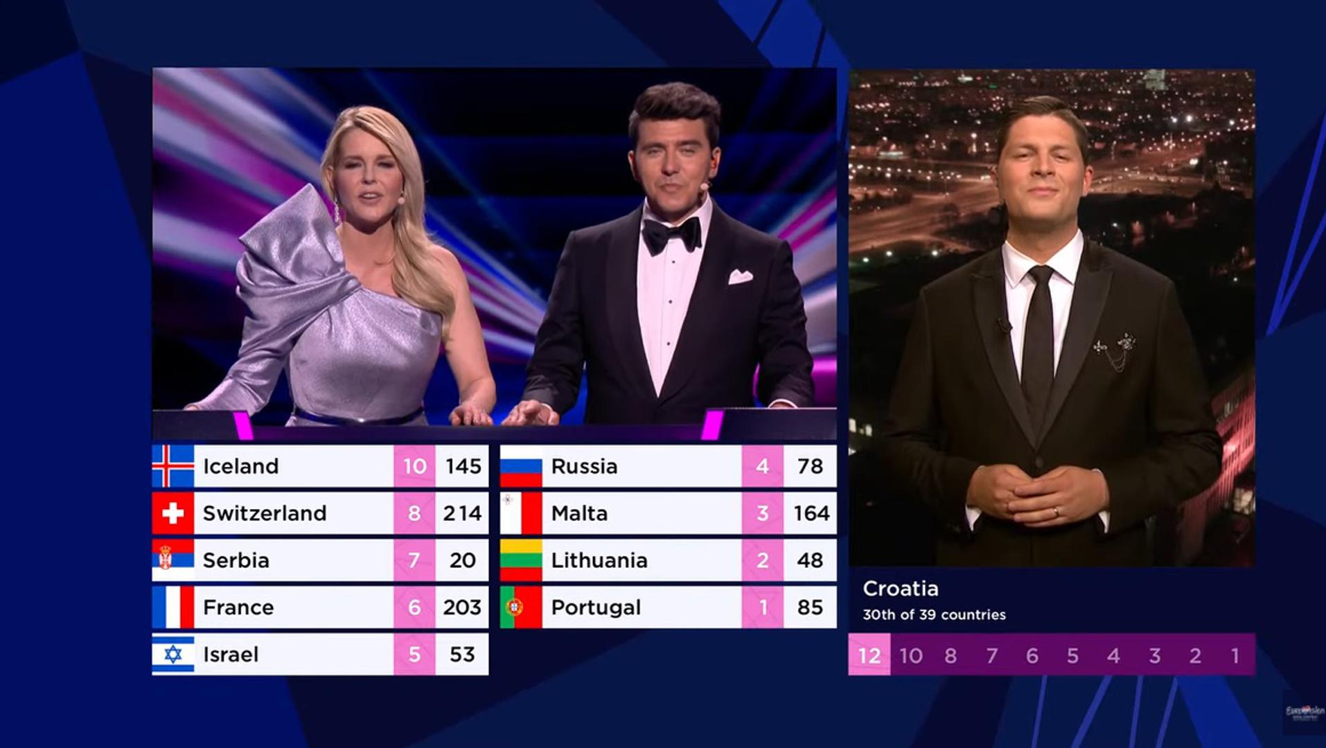 Prvi je glasao Izrael, a maksimalnih 12 bodova dali su Švicarskoj. Odmah nakon njih glasala je Poljska koja je maksimalne bodove dala San Marinu. San Marino je svojih 12 bodova dao Francuskoj. Albanija je 1 bod dala susjednoj nam Srbiji, to im je ujedno prvi i jedini bod. Švicarskoj su dali 12 bodova. Malta je 1 bod dala San Marinu, a 12 bodova je dala Albaniji. Estonski žiri 1 bod dodijelio je Malti, a 12 bodova otišlo je Švicarskoj. Sjeverna Makedonija dala je 12 bodova Srbiji.