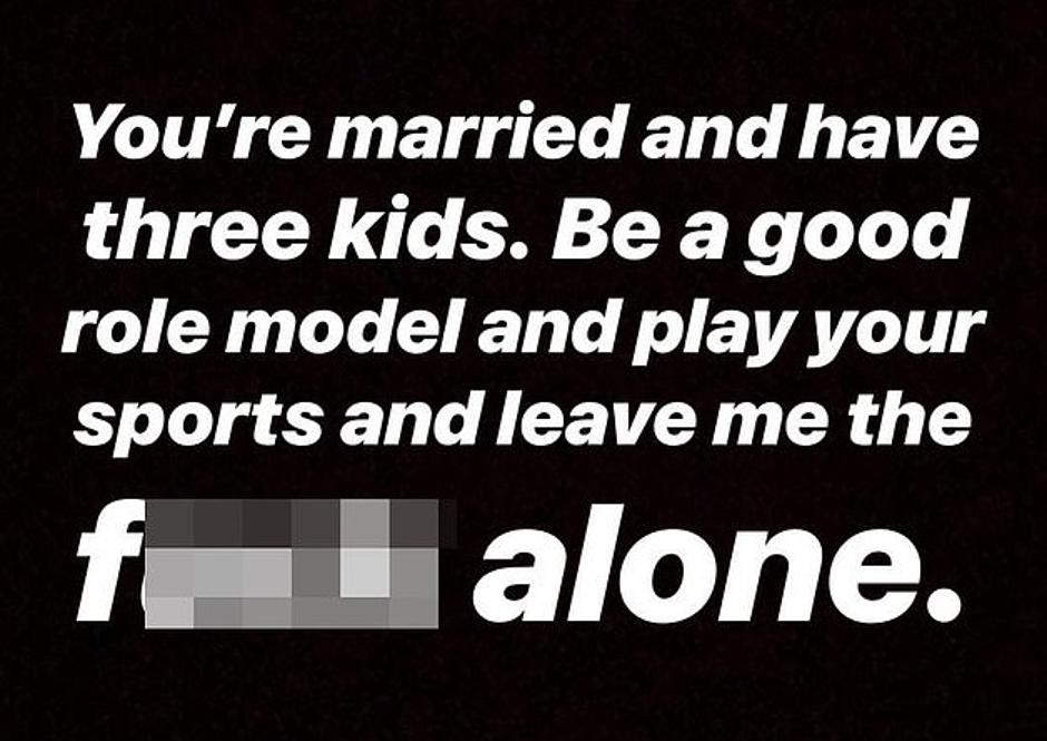Otkrila je i da mu je napisala da "bude dobar uzor, jer je oženjen i ima troje djece".  Na Instagram storyju podijelila je i "screenshot" razgovora koji on započinje  porukom "kada ću te vidjeti, prijateljice?", što je pjevačicu ozbiljno uzrujalo.